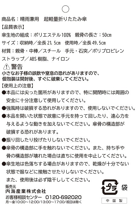 生地/ポリエステル 親骨・中棒/スチール 手元・石突/ポリプロピレン ストラップ/ABS樹脂、ナイロン