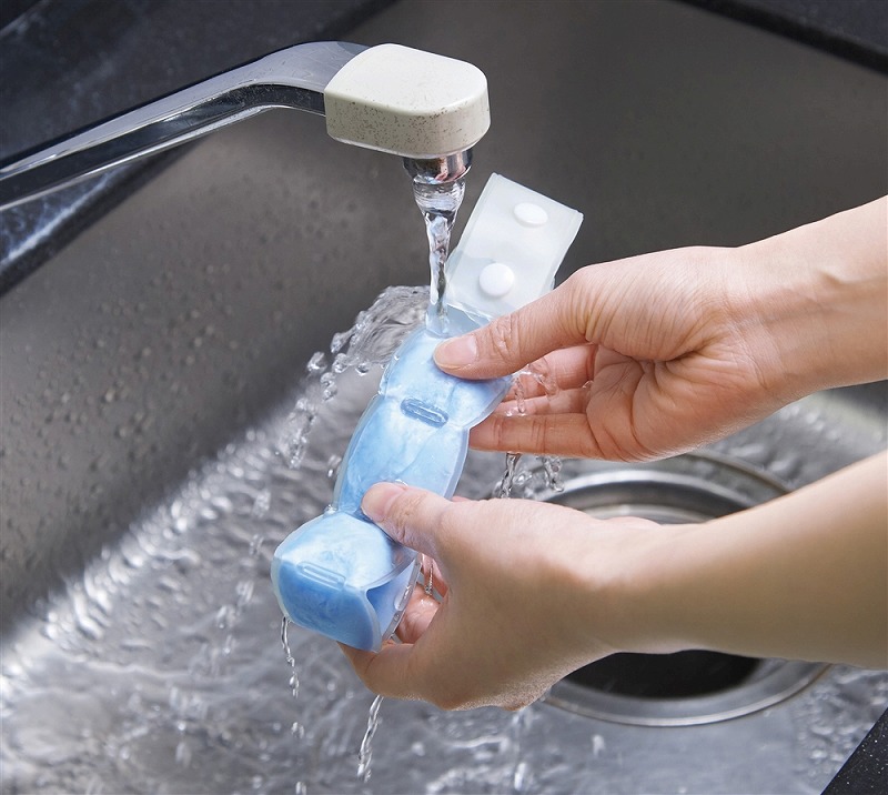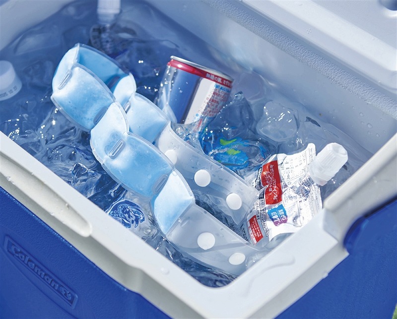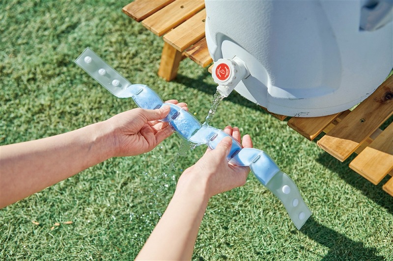 約28℃以下で自然凍結するPCM素材を使用しており、冷凍庫はもちろん、水道の流水でも凍結します。 本体に名入れも可能。 コンパクトに折りたためるので、身軽に歩きたい時にもぴったりです。