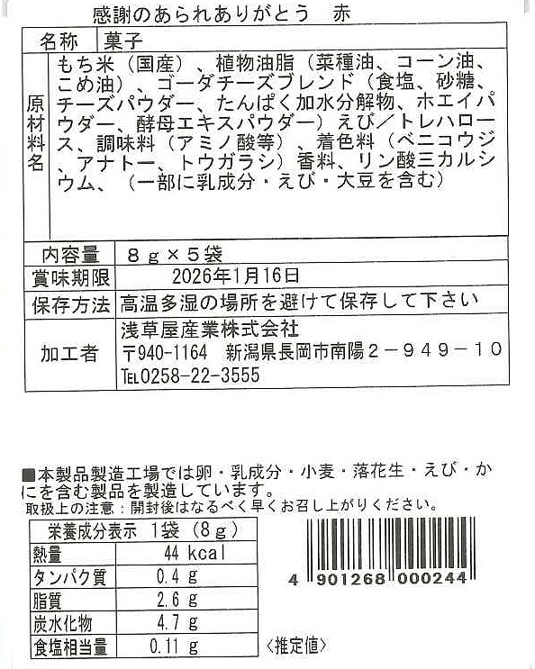 ほんのり塩味とえびの風味が特徴のおかきです。お茶請けに最適な個包装。また、パッケージには「ありがとう」の文字が入っており、挨拶回り品や来店記念品、敬老の日のプチギフト、シニア向け販促品、介護施設の記念品、敬老会の記念品など、ちょっとしたお礼の品や感謝の気持ちを伝えるのに最適です。
