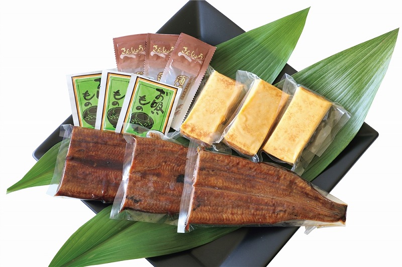 [セット内容] 浜名湖産うなぎ蒲焼カット110g×3、厚焼玉子120g×3、タレ・山椒×各3、吸物×3