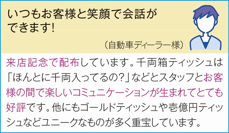 集客ツールとして店頭で積み上げておくとインパクトがある千両箱ティッシュ!