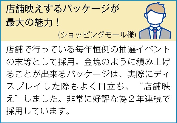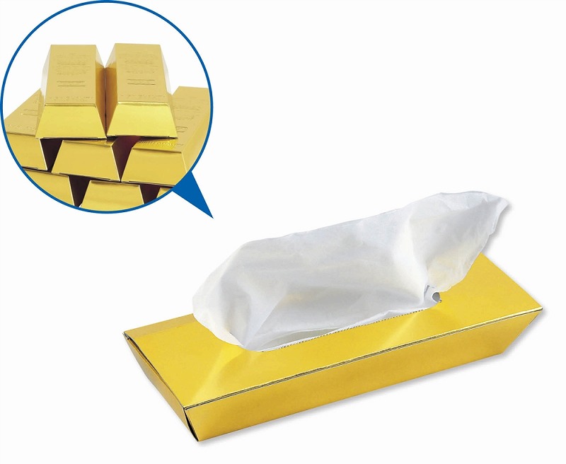 金塊をイメージしたインパクトのあるティッシュです。積み上げ陳列にぴったり。 天然パルプ100%原紙のお肌にとてもやさしいティッシュです。 蛍光染料はもとより、素肌の健康をそこなう材料は一切使用しておりません。積み上げて置けば、店頭のディスプレイやPOPとしても注目度UP!!