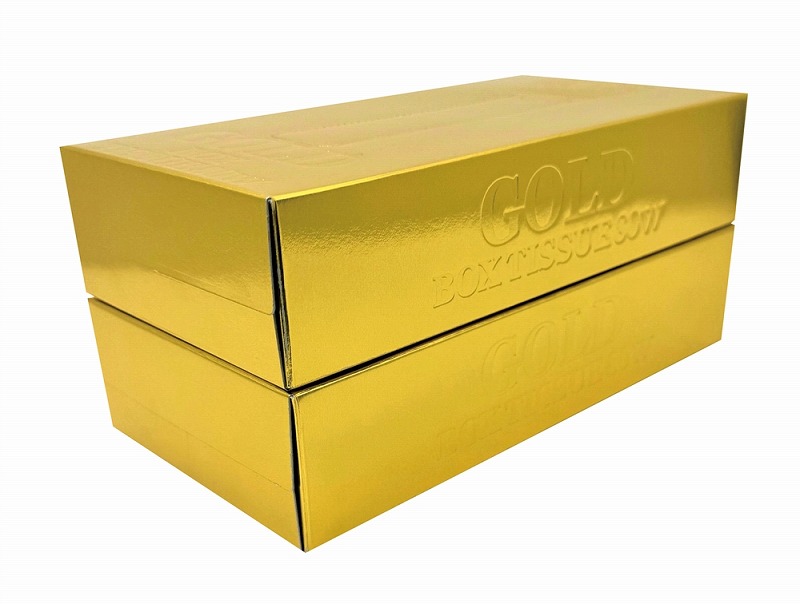 積み上げたくなる!ゴールドのパッケージは注目度抜群です。 お得な2個パックで、受け取る方も思わずにっこり♪会話がはずむゴールドBOXティッシュです。