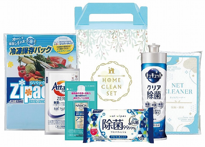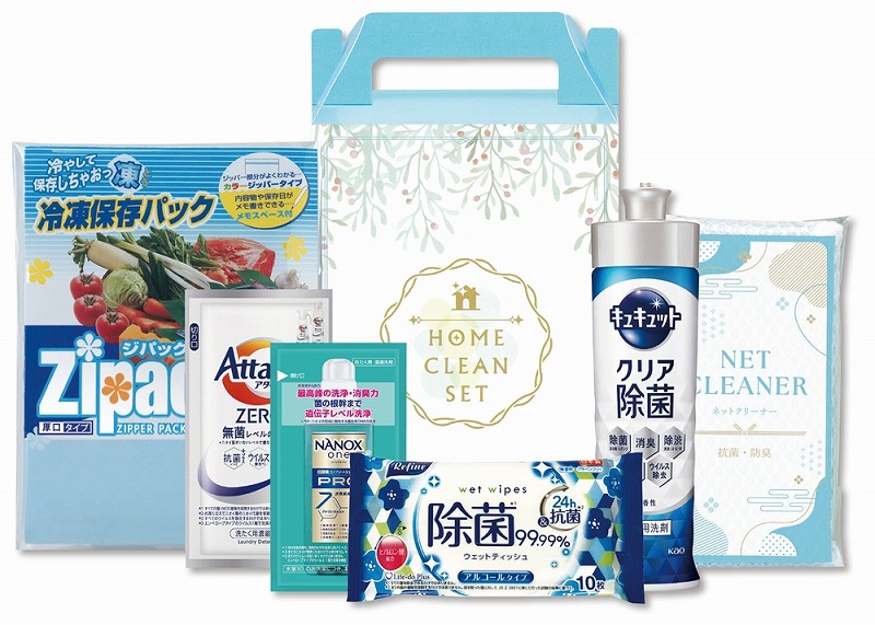 [セット内容] ・花王 キュキュット220ml(クリア除菌)×1 ・花王 アタックZEROワンパック10g×1 ・ライオン NANOX one PRO10g×1 ・ジパック冷凍保存パック3枚×1 ・リファインアルコール除菌ポケットウェットティッシュ10枚×1 ・ネットクリーナー×1