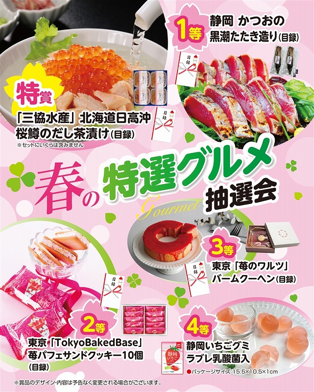 365日間(残日数120日以上) [特賞]「三協水産」 北海道日高沖 桜鱒のだし茶漬け(目録)・・・90日間(冷凍) [1等]静岡 かつおの黒潮たたき造り(目録)・・・35日間(冷凍) [2等]東京 「TokyoBakedBase」 苺パフェサンドクッキー10個(目録)・・・240日間(常温) [3等]東京 「苺のワルツ」 バームクーヘン(目録)・・・60日間(常温) [4等]静岡いちごグミ ラブレ乳酸菌入・・・365日間(常温)