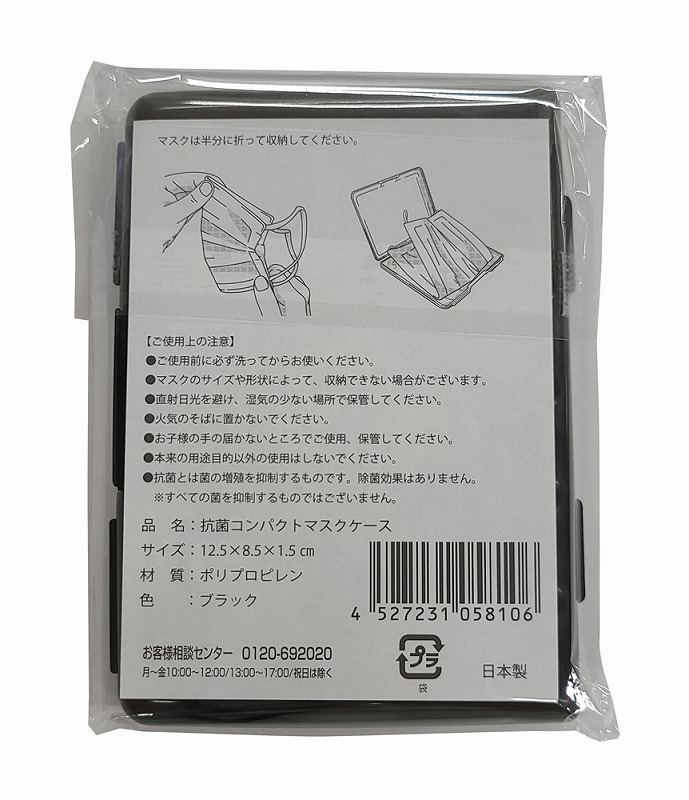 マスクを半分に折って収納します。厚さ約1.5cm/重量約29g(※必ず現品でご確認ください)でポストインにも最適。抗菌性試験実施済み(JISZ2801「抗菌加工製品ー抗菌性試験方法・抗菌効果」)