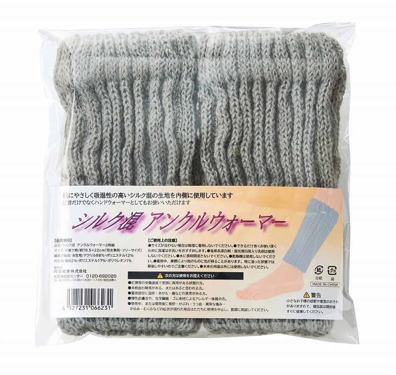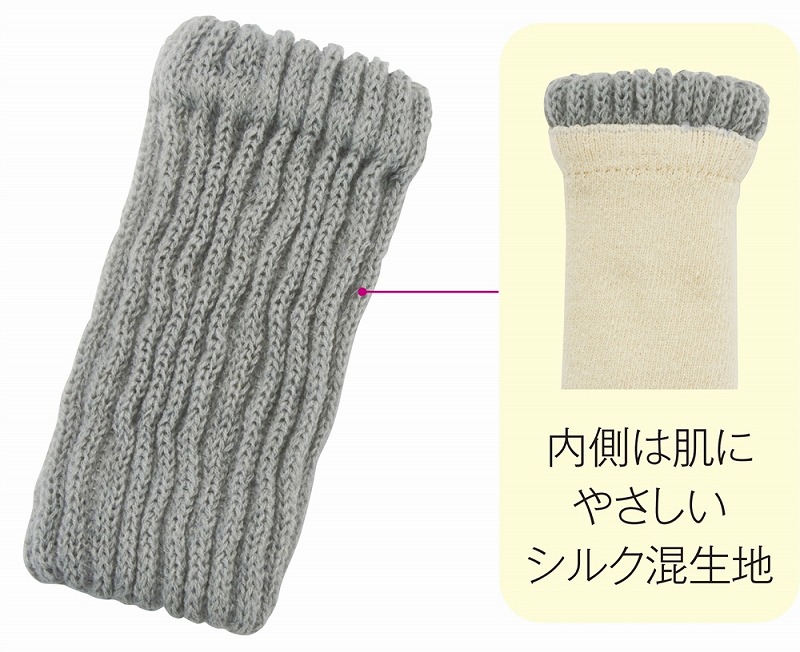 寒い季節に最適なアイテムです。内側は吸湿性に優れたシルク混生地でやさしい肌触りを実現し、外側はアクリル生地で暖かさをしっかりキープします。おやすみ時に足首を温めたり、ハンドウォーマーとして手首を保温したりと便利に使えます。冬のノベルティや節電にもおすすめです。
