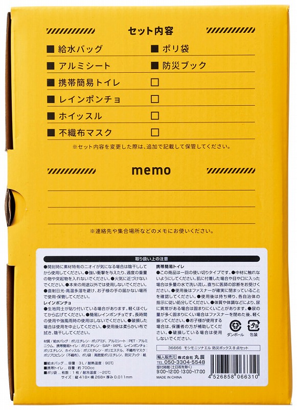 セット内容/給水バッグ3L・レインポンチョ・アルミシート(1400×700mm)・携帯簡易トイレ・ポリ袋×1・ホイッスル・不織布マスク・防災ブック
