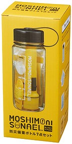 セット内容/ボトル・圧縮タオル(200×200mm)・アルミシート(1400×700mm)・LEDライト・レインポンチョ・ホイッスル・防災ブック、ボトル容量/630ml、ライト/単三乾電池2本使用(別途)
