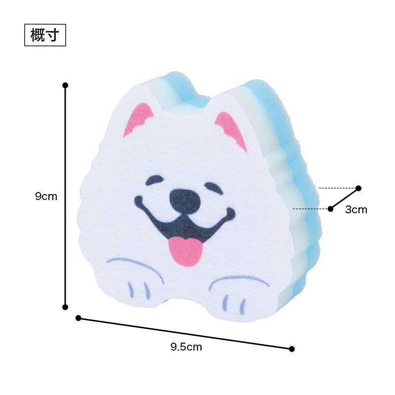 思わず笑顔になる”サモエドスマイル”が目を引くキッチンスポンジです。 愛らしい表情で親しまれ、近年人気のサモエドに『笑顔があふれますように』というメッセージを込めてデザインしました。