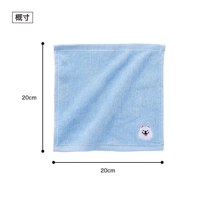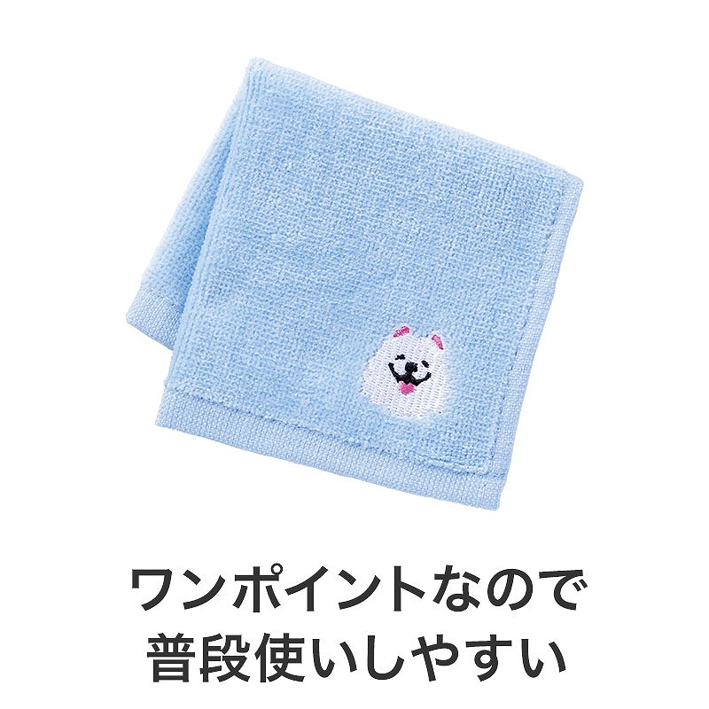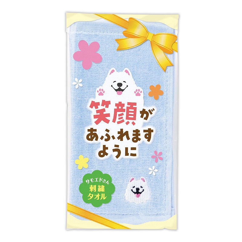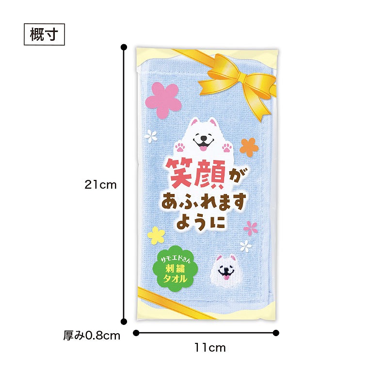 パッケージにも同じメッセージが入っており、ストレートに気持ちが伝わります。 ポケットやカバンに入れて携帯しやすい、約20×20cmサイズのハンドタオル。 刺繍はワンポイントなので、年齢・性別を問わず使いやすく、受け取ってもらいやすいアイテムです。 ふんわりとした手触りと、かわいいサモエドの刺繍が魅力。 毎日使いたくなる心地よさで、長く愛用していただけます。 スーパー・百貨店・保険・飲食・動物病院など、業種を問わず取り入れやすい点もポイントです。 長3封筒に入れることができるので、郵送での配布にもご利用いただけます。