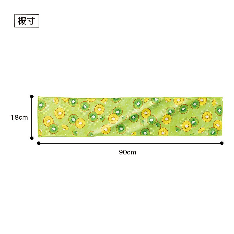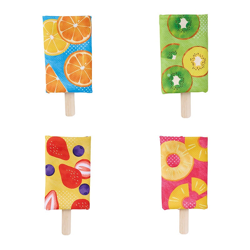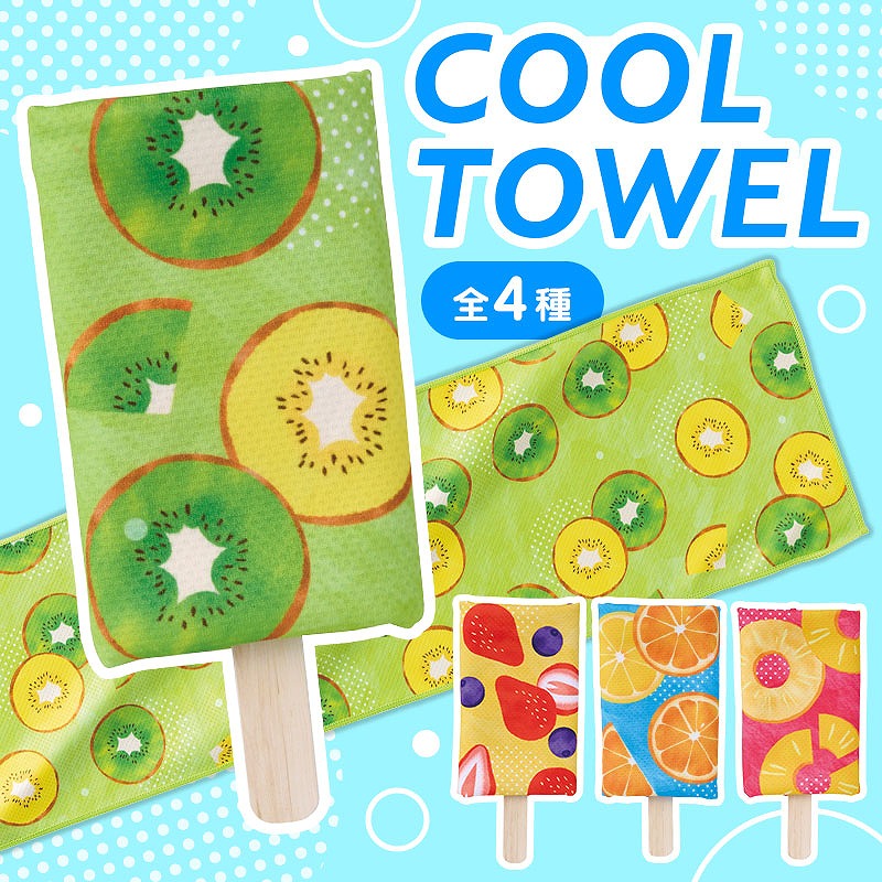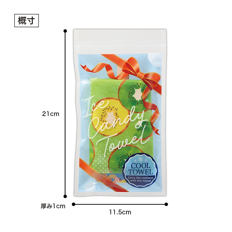 本体の柄はパイナップル・オレンジ・キウイ・ストロベリーの4種アソート。 カラフルなので並べるだけでも映え、目を惹きやすいのもポイントです。 アイスの棒を模した台紙にはタオルの使い方を記載しており、初めての方でも迷わず使うことができます。 タオルは濡らして振るだけで冷たくなり、暑さ対策として活躍します。 首や頭に巻きやすい約18×90cmサイズ。 パッケージがジッパー袋のため、濡らした後でも収納しやすく、持ち歩きにも便利です。 水さえあればその場で使用できるため、夏のイベントや暑い時期の配布物として活躍します。