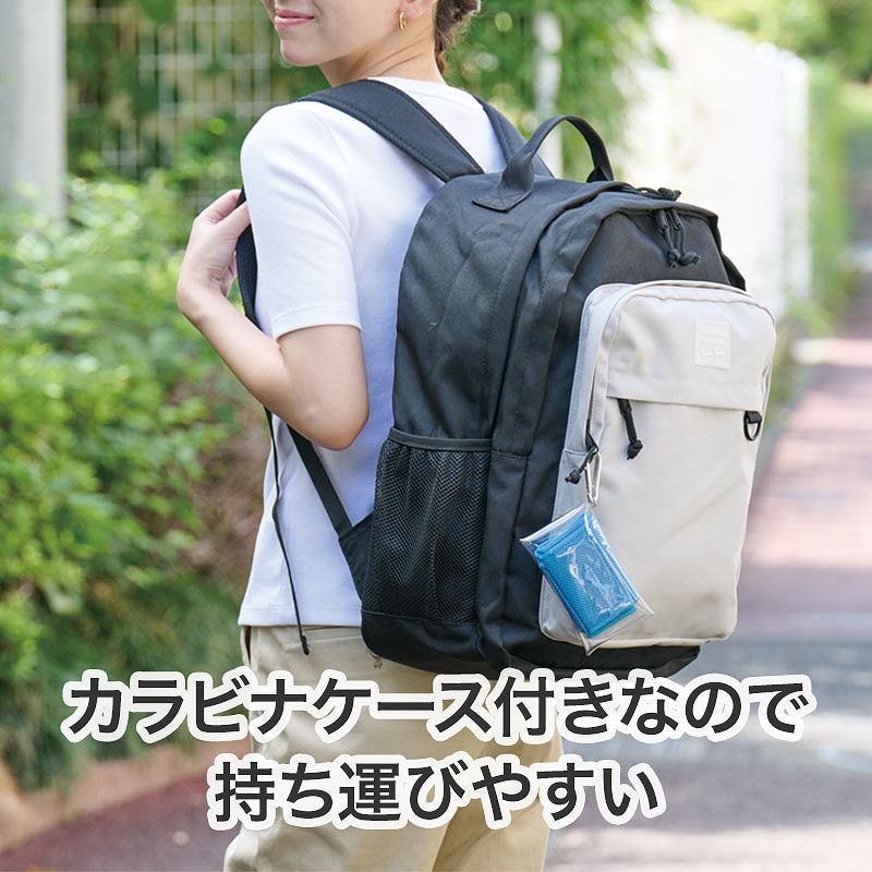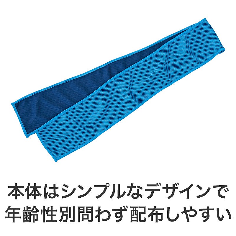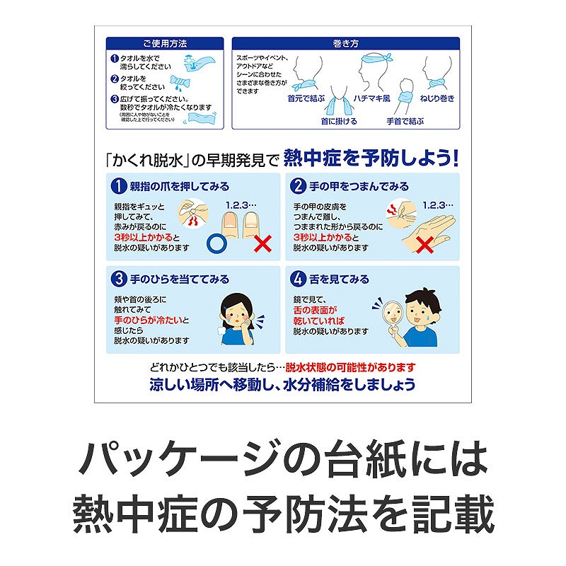 持ち運びに便利なカラビナ付きケースがセットになっており、使わないときはケースに収納しておけます。 PVC製なので、タオルが濡れた状態での収納もOK。 プラボタンを外すとフルオープンになるため出し入れしやすく、お手入れも簡単。 ケースには名入れが可能で、イベントロゴや施設名を入れると記念品として印象に残ります。 タオルは首や頭に巻きやすい約8×90cmサイズ。 さらに台紙には「かくれ脱水の早期発見方法」を記載しており、健康への気遣いを示せる点もポイントです。 長3封筒で郵送できるため、DM施策としても扱いやすい仕様になっています。 夏のイベントやレジャー施設での配布に適しており、暑い時期のノベルティとして幅広く活用できます。
