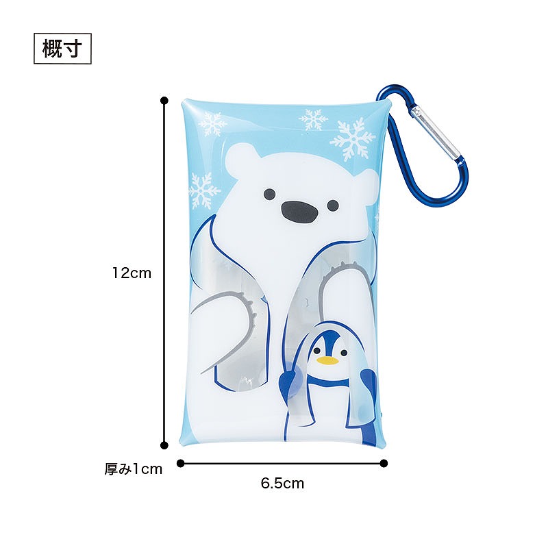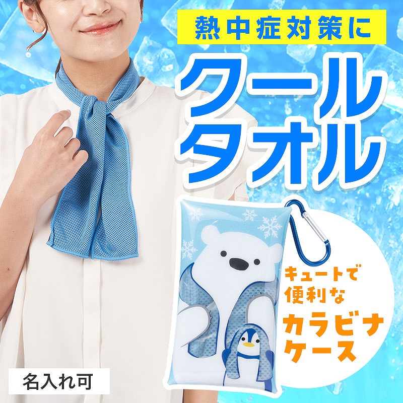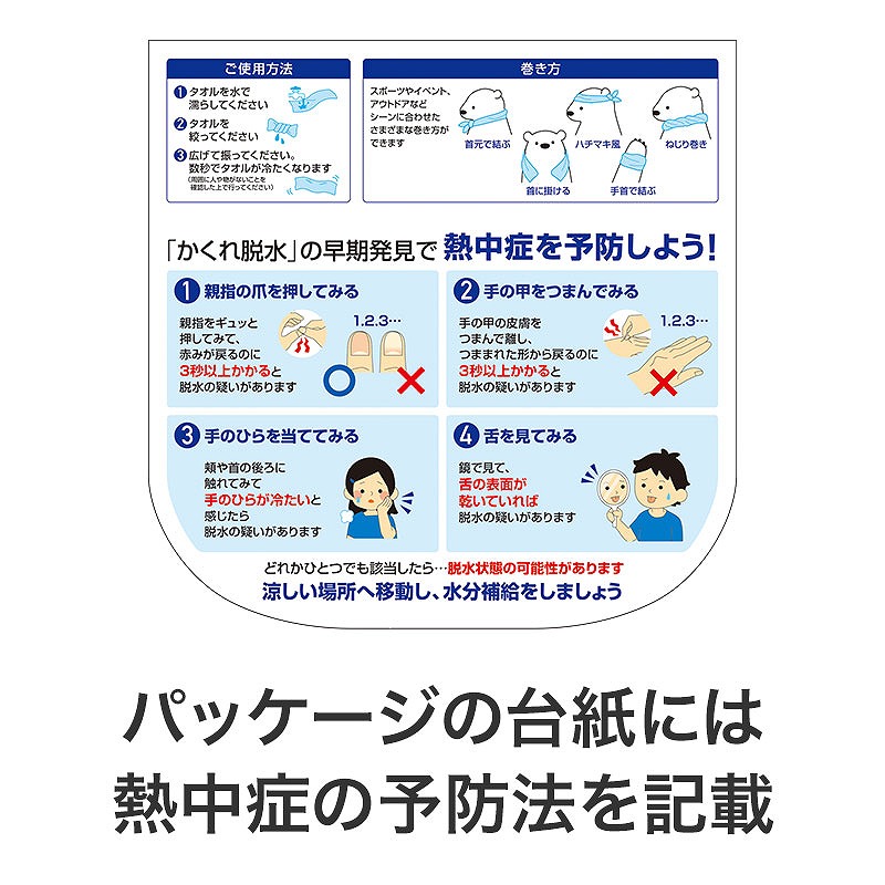 持ち運びに便利なカラビナ付きケースがセットになっており、使わないときはケースに収納しておけます。 PVC製なので、タオルが濡れた状態での収納もOK。 プラボタンを外すとフルオープンになるため出し入れしやすく、お手入れも簡単。 ケースにはしろくまとペンギンのイラストが入り、キーホルダー感覚でぶら下げてもかわいいデザインです。 お子さまから高齢者まで幅広い年代で使いやすく、夏場の配布物として喜ばれやすい点も魅力です。 タオルは首や頭に巻きやすい約8×90cmサイズ。 さらに台紙には「かくれ脱水の早期発見方法」を記載しており、健康への気遣いを示せる点もポイントです。 長3封筒で郵送できるため、DM施策としても扱いやすい仕様になっています。 夏のイベントやレジャー施設での配布に適しており、暑い時期のノベルティとして幅広く活用できます。