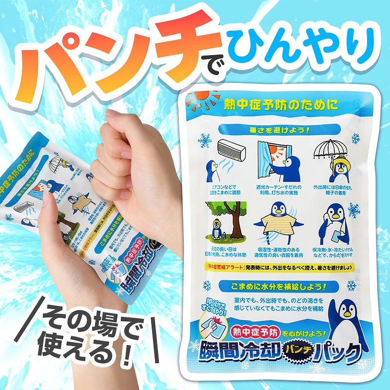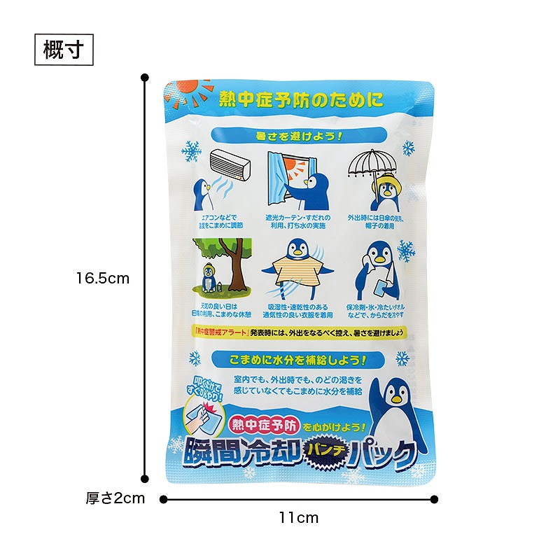瞬間冷却としての使用は1回限りですが、冷凍庫で凍らせれば通常の保冷剤として繰り返し使えます。 持ち帰ってからも活用しやすく、長く使っていただける仕様です。 本体には熱中症予防の知識をプリントしており、アイテムとしての役立ちと情報面での啓発を同時に叶える優れもの。 告知物やイベント配布に取り入れやすい点も特徴です。 夏のイベントやスポーツ行事に適しており、暑い時期に幅広く活用できます。