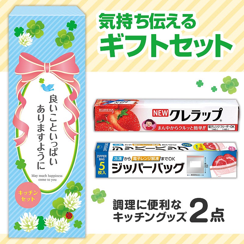 ギフトボックスは四つ葉のクローバーをモチーフにした華やかなデザイン。 手触りの良い上質紙を使用しており、店頭に並べても目を引く仕上がりです。 [NEWクレラップ(22cm×10m)] 巻き戻りしにくく、引き出しやすい人気の食品用ラップ。 毎日の調理や保存に欠かせない、もらって嬉しい定番アイテムです。 [ジッパーバッグ(5枚入)] 使い勝手の良い縦21×22cmの万能サイズ。 Wジッパー仕様で汁モレしにくく、冷凍保存からレンジ解凍まで対応できます。 食品名や日付を書けるメモ欄付きで便利です。 実用性と華やかさを兼ね備えた、手軽に贈れるキッチンギフトです。 ※ご注文はケース単位で、お願い