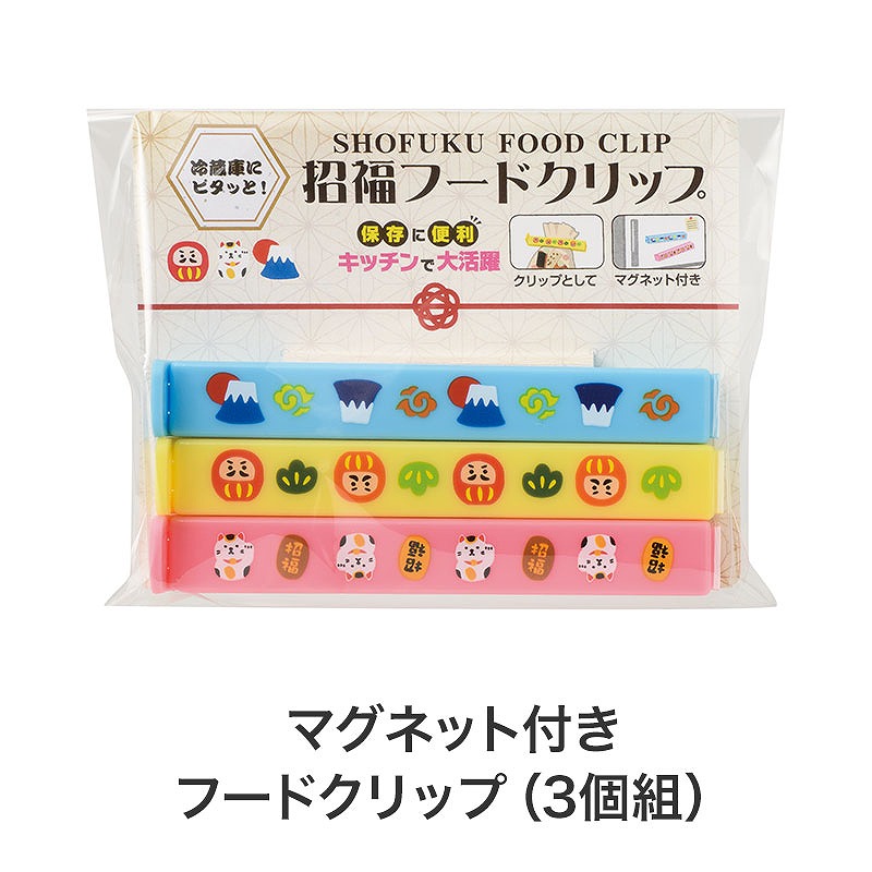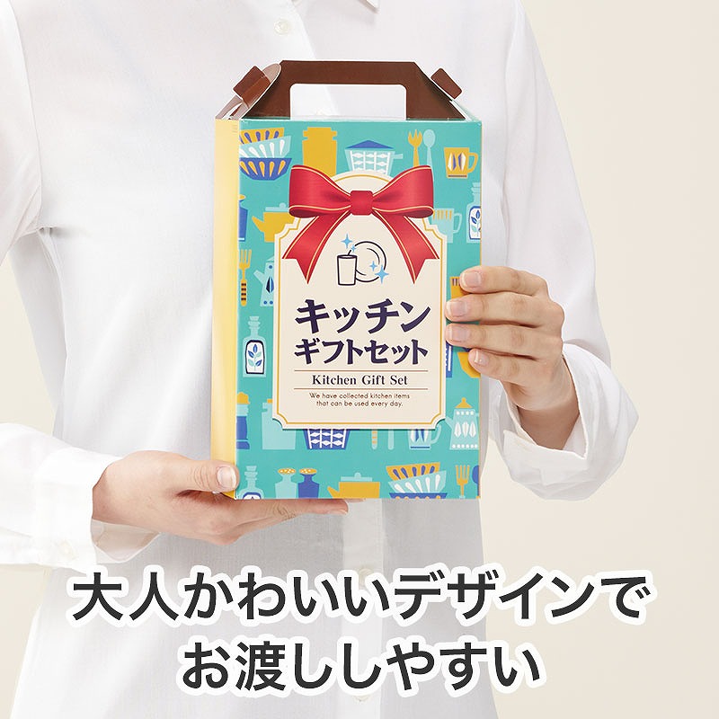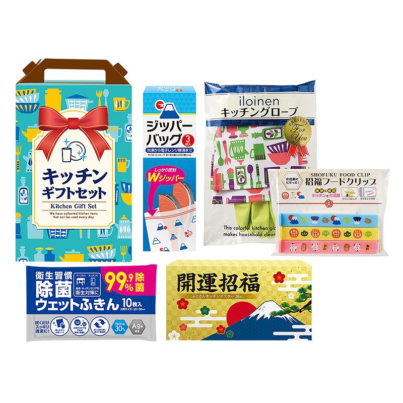 ギフトボックスは、さまざまなキッチンアイテムを鮮やかに描いた楽しいデザイン。 受け取った方の気分が上がる華やかな仕上がりで、店頭に並べても目を引きます。 持ち手付きで持ち帰りやすく、上質紙を使用したしっかりとしたパッケージです。 [ジッパーバッグ(3枚入)] 富士山デザインのWジッパー仕様で汁モレしにくく、冷凍保存からレンジ解凍まで対応できます。 [キッチンダスター(20枚入)] ブルー基調の富士山デザインが爽やかなダスター。 レーヨン100%で吸水性・速乾性に優れ、繰り返し使えて衛生的です。 [衛生週間除菌ウェットふきん(10枚入)] 除菌率99.9%、Ag+配合のウェットふきん。 テーブルや電子レンジ、冷蔵庫など、気になる部分の拭き掃除に使えます。 ※すべての菌を除菌するものではありません。 [キッチングローブ] 料理やお皿洗いに便利なグローブ。 袖口の華やかなデザインでキッチン時間が楽しくなります。 ※グリーン・パープル・ピンクのいずれかが入ります。 [フードクリップ(3個組)] 食品の袋をしっかり留めて、こぼれ落ちや劣化を防ぐ便利アイテム。 マグネット付きで冷蔵庫にも貼り付けられます。 富士山・だるま・招き猫の3種類入りです。 実用性と満足感を兼ね備えた、幅広いシーンで活躍するキッチンギフトです。 ※ご注文はケース単位で、お願いいたします。