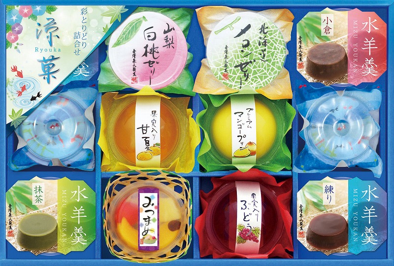 水羊羹練り 60g×2個、水羊羹小倉 60g×1個、水羊羹抹茶 60g×1個、能登塩ぜりぃ 58g×2個、みつ豆ゼリー 75g×1個、プレミアムマンゴープリン 75g×1個、果実入り甘夏ゼリー 75g×1個、果実入りぶどうゼリー 75g×1個、北海道メロンゼリー 52g×1個、山梨白桃ゼリー 52g×1個