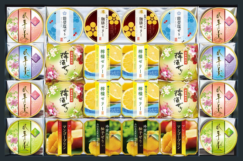 金澤オリジナル珈琲ゼリー 52g×2個、能登塩ぜりぃ 52g×2個、水羊羹小倉 60g×4個、水羊羹練り 60g×2個、水羊羹抹茶 60g×2個、梅酒ぜりぃ 75g×4個、能登塩入り檸檬ゼリー 75g×4個、プレミアムマンゴープリン 75g×2個、蜂蜜入り柚子ぜりぃ 75g×2個