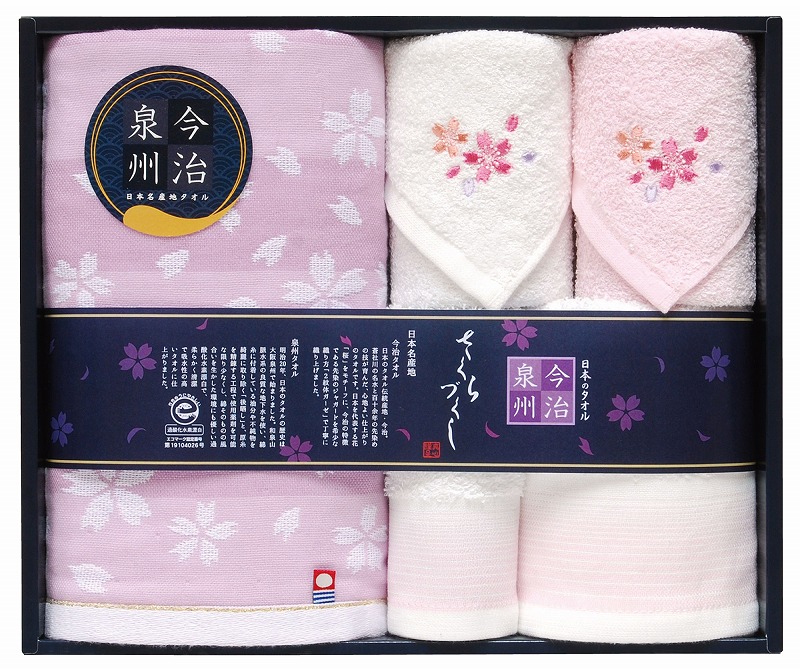 フェイスタオル(今治):34x75 x1 フェイスタオル(泉州):29x75 x1 ハンドタオル(泉州):29x29 x1 大判タオルハンカチ(泉州):29x29 x2