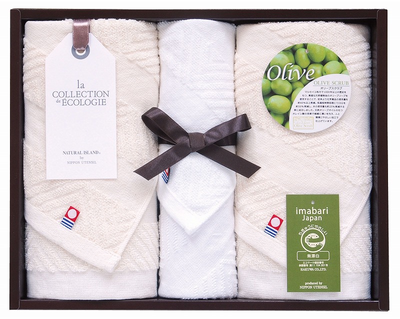 フェイスタオル(オリーブスクラブ・エコマーク認定):33x75 x2 ハンドタオル(オリーブスクラブ):33x35 x1