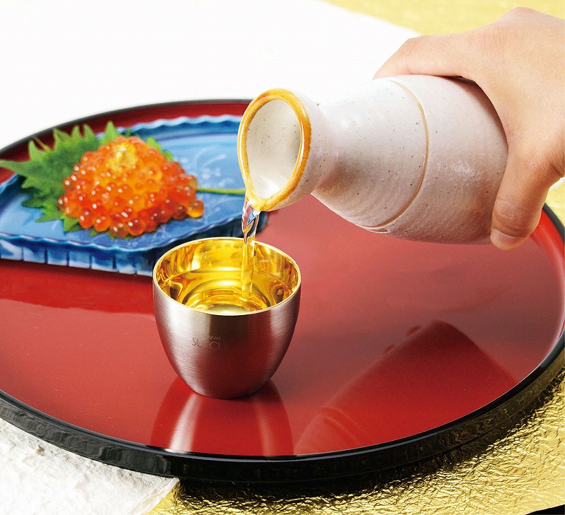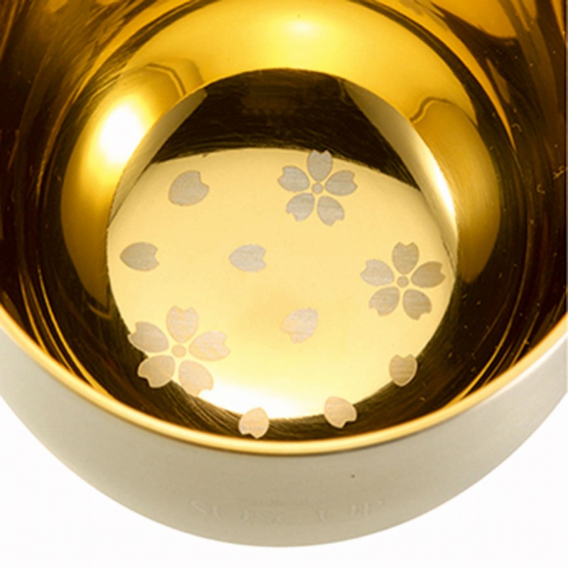 二重構造なので熱燗でも大丈夫です。更に24金メッキを施してあるので金属臭がなく、殺菌・抗菌性に優れているので安心してご使用できます。内面に桜模様を入れました。