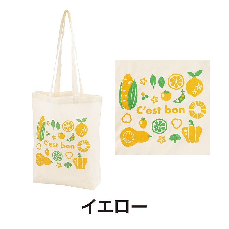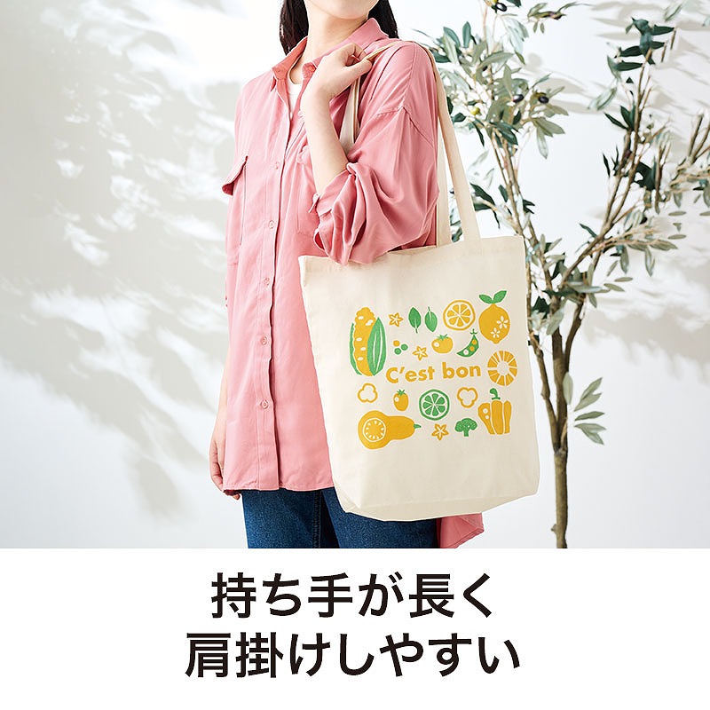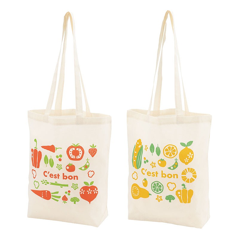 スーパーマーケットやマルシェイベントを開催する食品業界・食品メーカー様の配布アイテムとしてもおすすめです。 肌ざわりの良いコットン素材を使用し、4オンスの程よい厚みで使いやすい仕上がり。 底マチは約11cmあり、見た目以上の収納力でたっぷり荷物を入れることができます。 持ち手は長めに設計されているため肩掛けもしやすく、荷物が多くなっても安心です。 通勤・通学時のサブバッグとしてはもちろん、日ーのお買い物やお散歩用のエコバッグとしてなど、さまざまなシーンで活躍します。 デザインはレッドとイエローの2色アソートです。 裏面は無地仕様なので名入れにも対応しており、企業名やロゴを印刷すればPR効果の高いオリジナルコットンバッグとして活用できます。