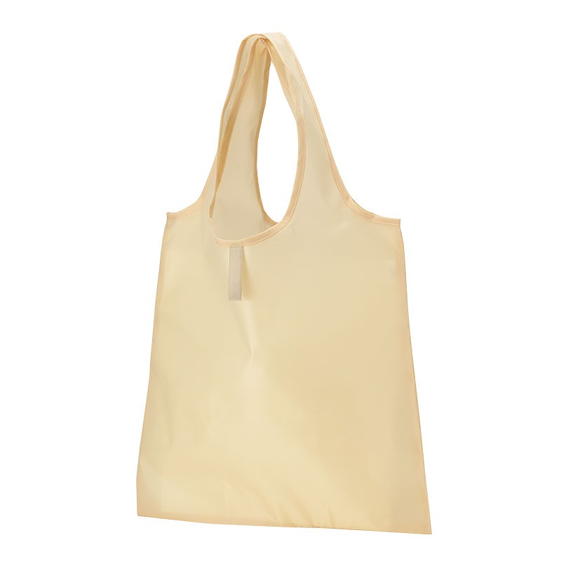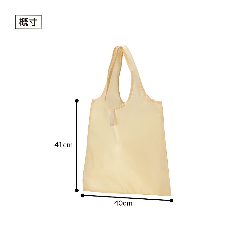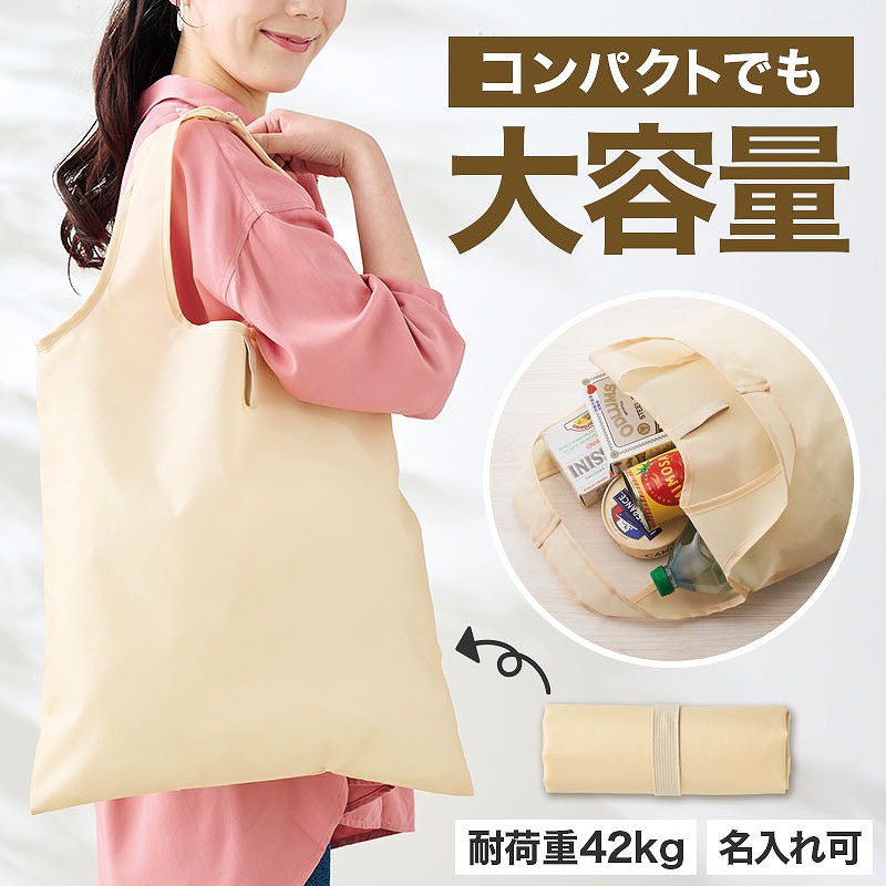 やさしい印象のベージュカラーで、さまざまなシーンに自然になじみます。 大きめサイズで荷物をしっかり収納できる一方、使わないときはたたんでゴム紐でコンパクトにまとめることができます。 バッグの中に入れておいてもかさばりにくく、急なお買い物の際にもすぐに使える便利さが魅力。 肩掛けしやすい形状で持ち運びもしやすく、日常使いのエコバッグとして活躍します。 ベーシックなカラー展開のため名入れも映えやすく、企業名やロゴ、イラストなどを1色印刷するだけでもしっかりとPR効果を発揮します。 販促品やキャンペーン配布など、オリジナルノベルティとしてのご利用にもおすすめのエコバッグです。