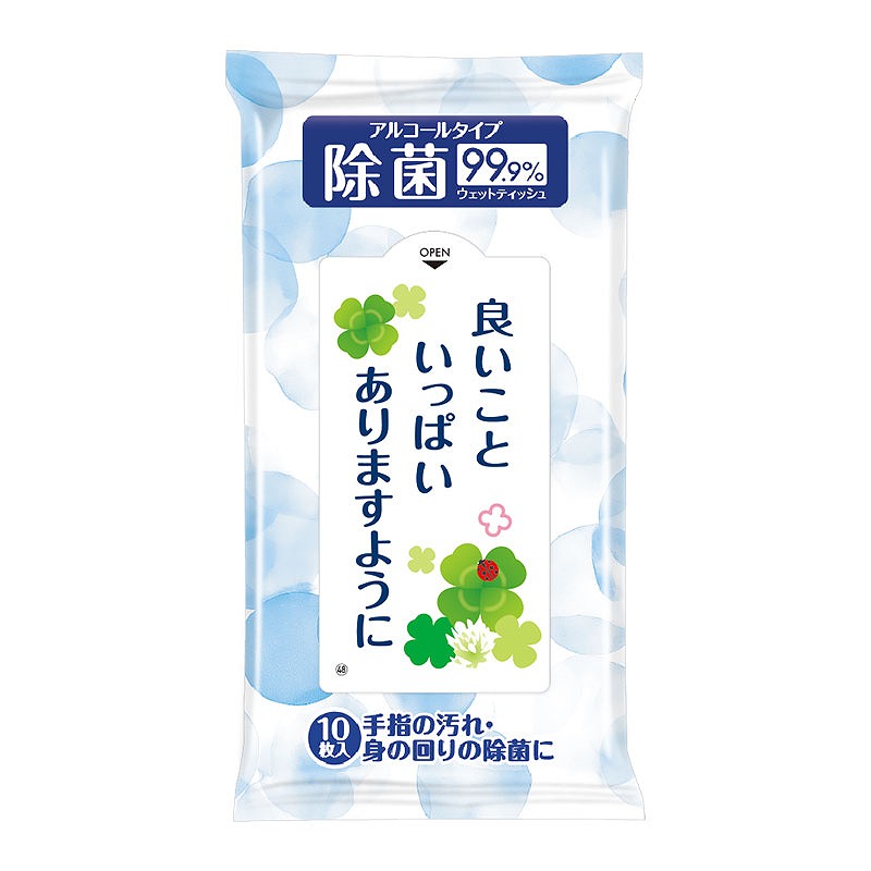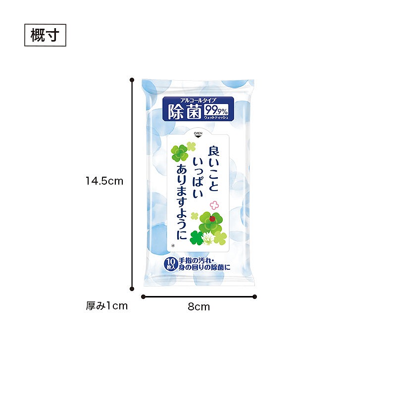 持ち歩きに便利な携帯サイズなので、外出先でも手軽にお使いいただけます。 本体のフタ部分には「良いこといっぱいありますように」というメッセージをデザイン。 受け取った方が思わず笑顔になるような、やさしい気持ちを届けるアイテムです。 ちょっとした配布品やプチギフトとしてもおすすめです。 ※除菌試験合格(除菌率99.9%) ※すべての菌を除菌するものではありません。