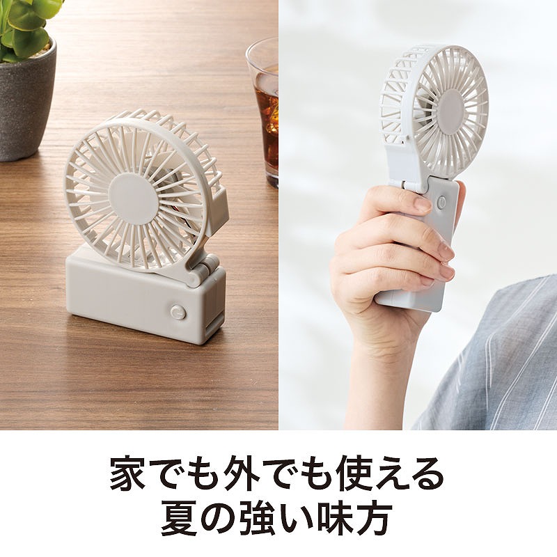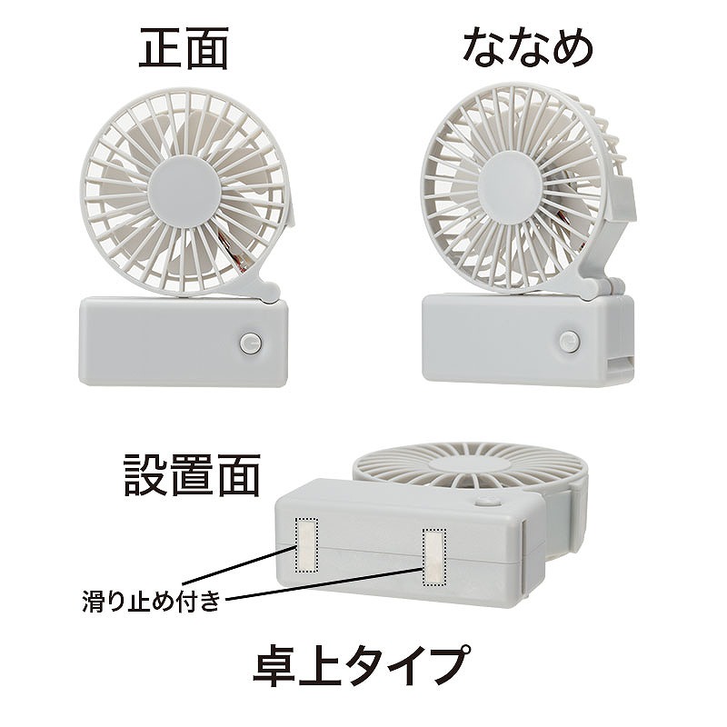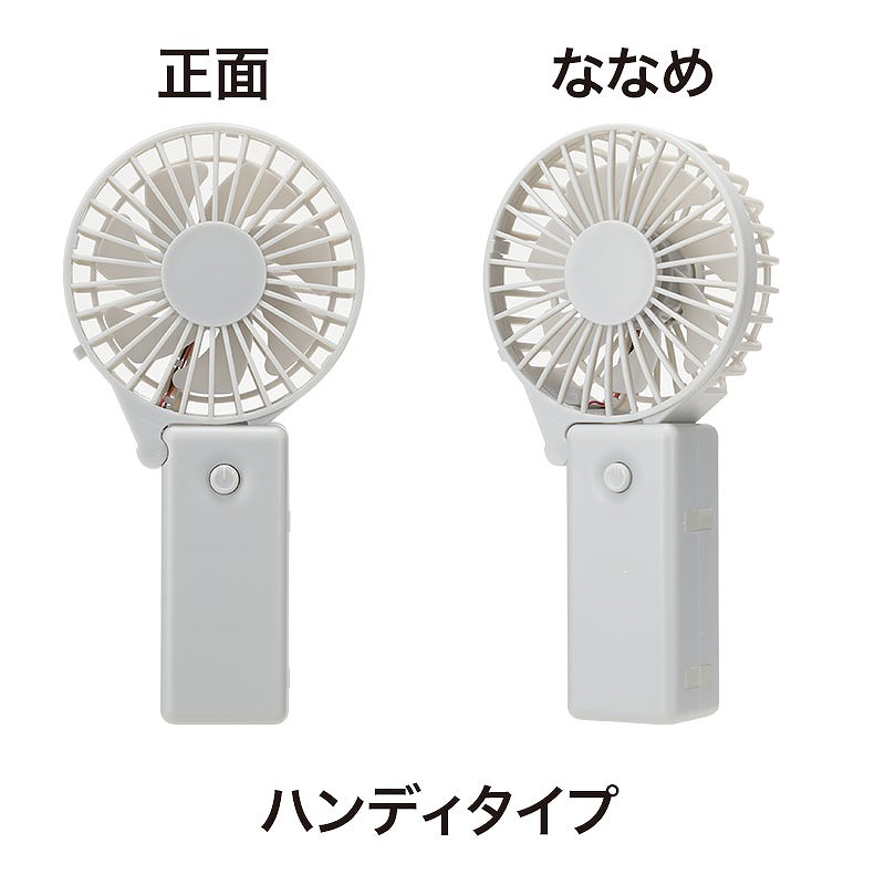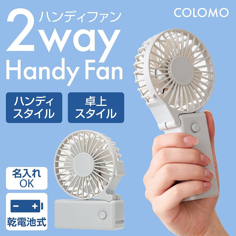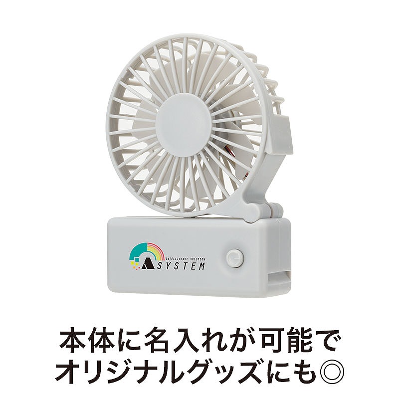 「ハンディタイプ」として片手で持って使えるため、屋内外を問わず手軽に涼しさを感じられます。 シンプルな構造で持ち運びもしやすく、外出先でもストレスなくお使いいただけます。 ファン部分の下で折り曲げると「卓上タイプ」として使用可能。 机やテーブルの上に置いて使えるので、両手を自由に使いながら涼しく快適に過ごせます。 底面には滑り止めが付いており、安定して設置できるのもポイントです。 単三乾電池2本で動作するため、使いたいときにすぐ使える手軽さも魅力。 ファンカバー中央や柄の部分には名入れも可能で、企業ロゴなどを入れたオリジナルグッズとしても活用できます。 アウトドアイベントやお祭り、住宅展示場などでの配布品・景品としておすすめです。