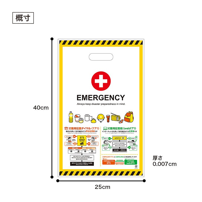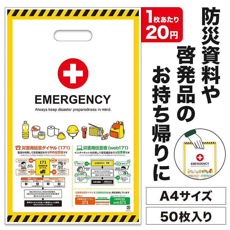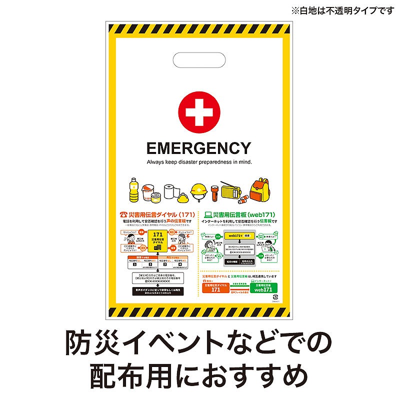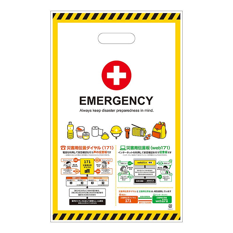 袋には災害用伝言ダイヤル(171)、災害用伝言板(web171)について記載しており、防災意識の啓発にも役立ちます。 サイズはA4書類が入る使いやすい大きさで、防災イベントや啓発活動で配布する資料やノベルティの持ち帰り用として便利に使用できます。 小判抜きタイプのため持ちやすく、イベント会場でも配布しやすいのが特長です。 50枚入りで、1枚あたり20円(税抜)と導入しやすい価格帯。 警察や自治会、企業の防災イベントなどでの資料配布用としておすすめです。
