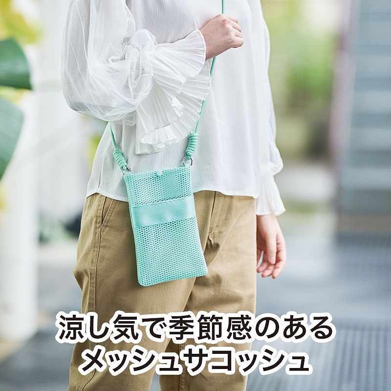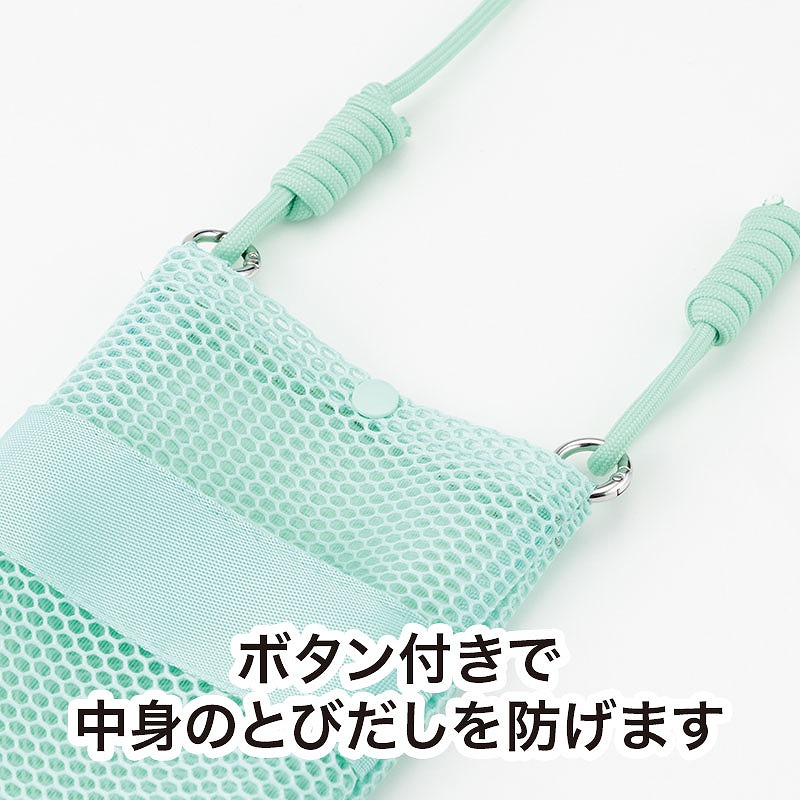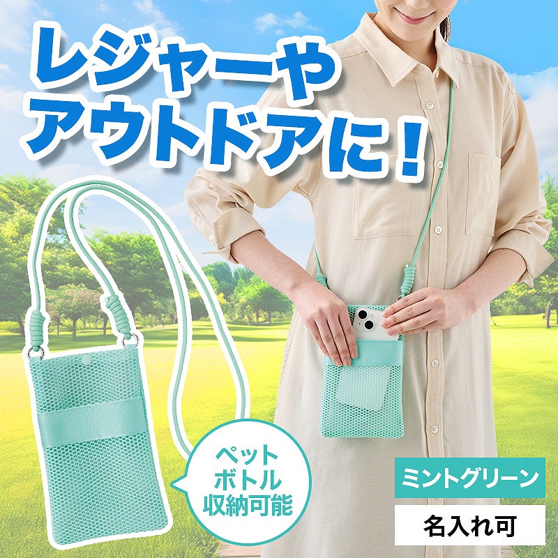 爽やかなミントグリーンカラーで、明るく軽やかな印象のデザインです。 サコッシュ上部にはボタンが付いているため中身の飛び出しを防ぐことができ、オープンポケット付きで使い勝手も抜群。 ショルダーは約160cmと長めなので、体格や好みに合わせて結んで長さを調整して着用できます。 オープンポケット上部に名入れが可能で、スポーツチーム名やロゴ、イベント名・開催年度などを印刷すれば、オリジナルグッズとして活用でき、記念品としても長く愛用していただけます。