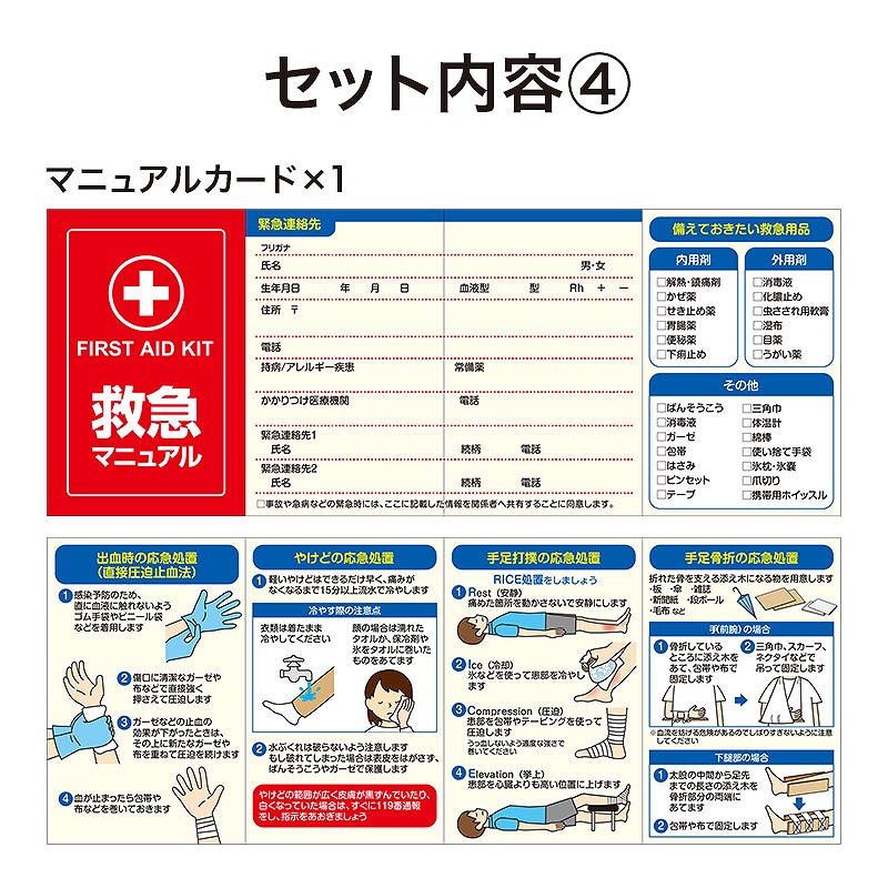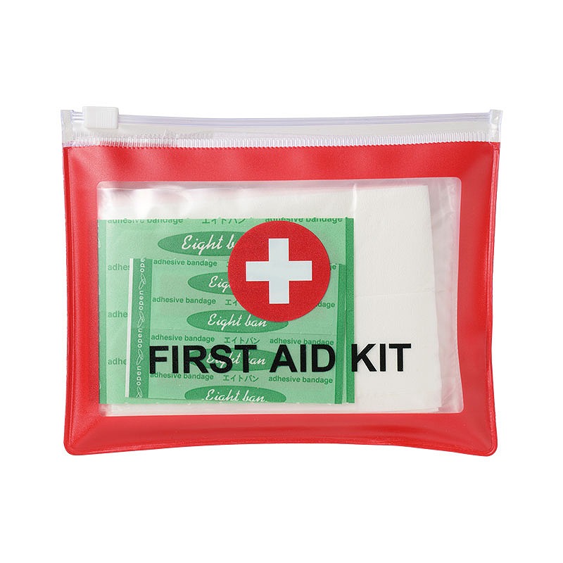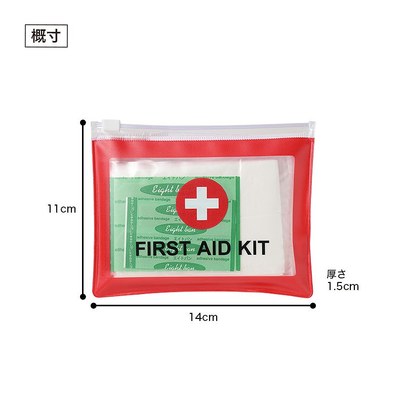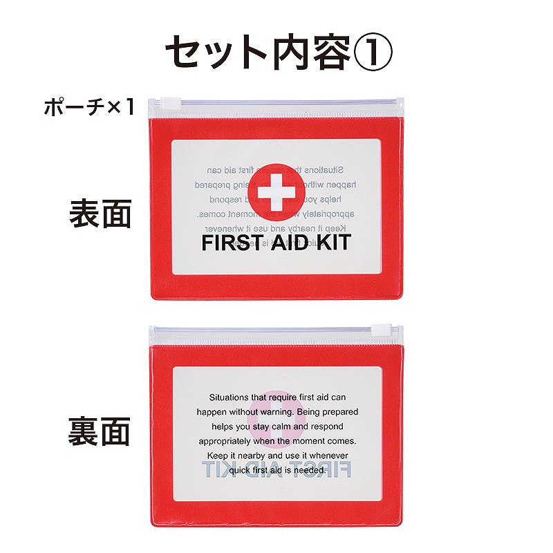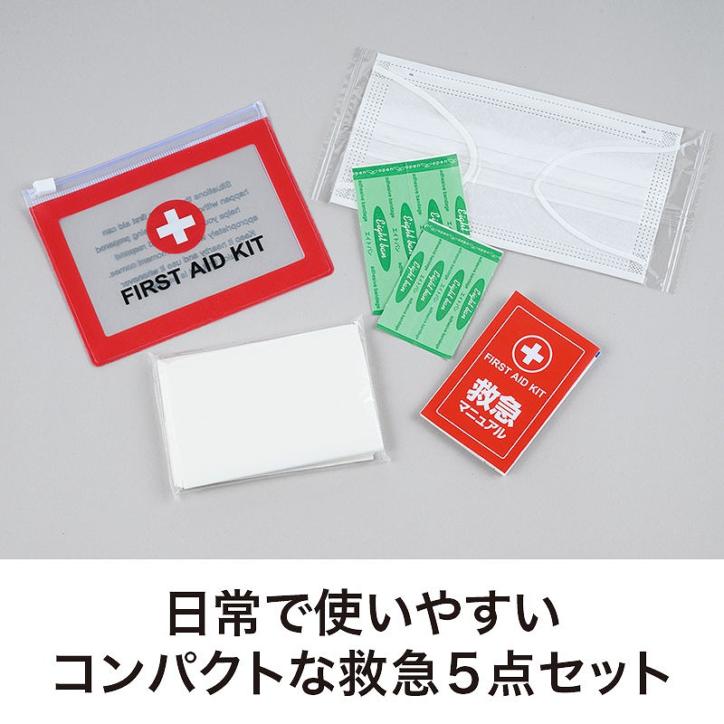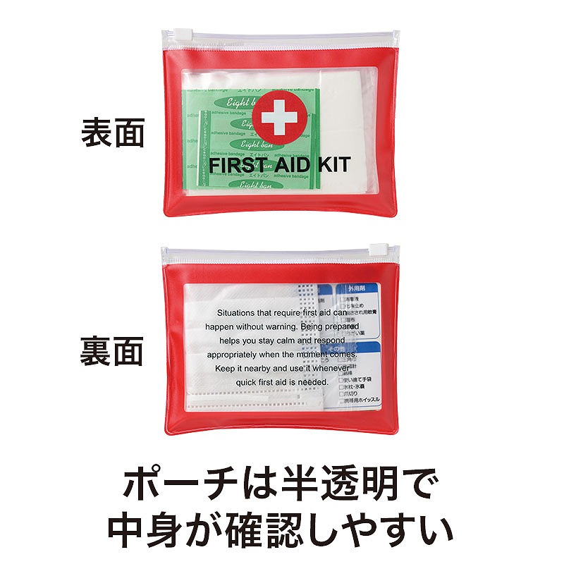 日常生活の中でも身近に置いておきやすい、シンプルなデザインのセットになっています。 薄くてコンパクトなサイズなので、通勤・通学時のバッグに入れて持ち歩いたり、災害時にもすぐ持ち出せるのが特長です。 セット内容は、ポーチ、応急処置の方法が書かれたマニュアルカード、ばんそうこう(M×2・S×2)、マスク、ポケットティッシュ。 ポーチにまとめて収納されているため、必要に応じてご自身で薬などを追加してカスタマイズすることもできます。 官公庁や自治体、企業の安全啓発行事での配布品としてはもちろん、防災訓練や防災イベントでの配布にもおすすめ。 日常でも備えとして役立つ実用的な防災グッズです。