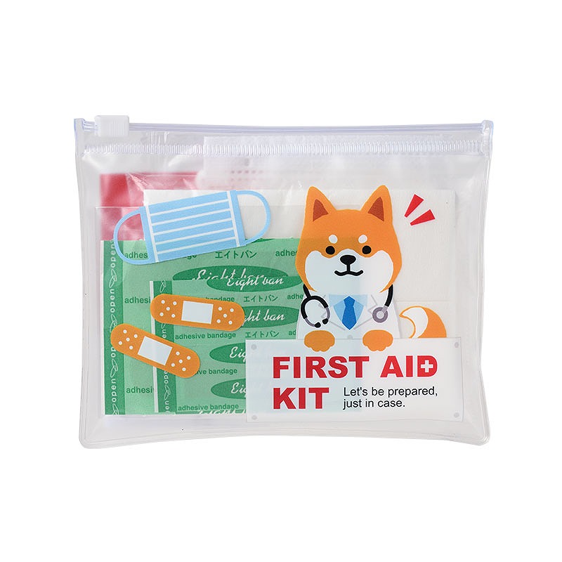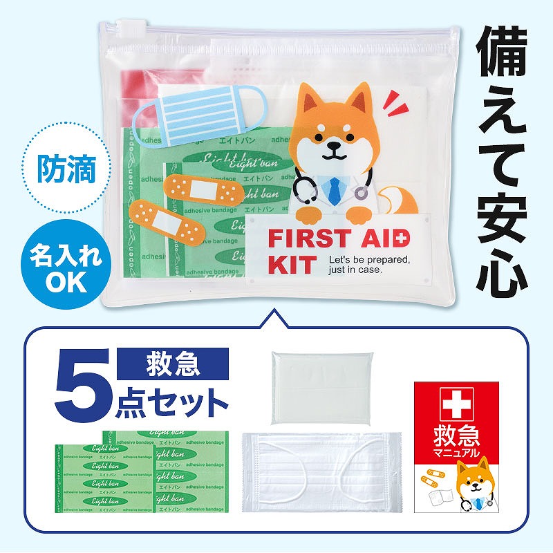 「わんわんドクター」のやさしいアニマルデザインで、非常時でも気持ちを落ち着かせてくれるようなポーチに仕上げました。 薄くてコンパクトなサイズなので、通勤・通学時のバッグに入れて持ち歩いたり、災害時にもすぐ持ち出せるのが特長です。 セット内容は、ポーチ、応急処置の方法が書かれたマニュアルカード、ばんそうこう(M×2・S×2)、マスク、ポケットティッシュ。 ポーチにまとめて収納されているため、必要に応じてご自身で薬などを追加することもできます。 官公庁や自治体、企業の安全啓発行事での配布品としてはもちろん、防災訓練や防災イベントでの配布にもおすすめ。 ポーチの裏面は無地のため名入れも可能で、オリジナルの防災啓発グッズとして活用しやすい商品です。