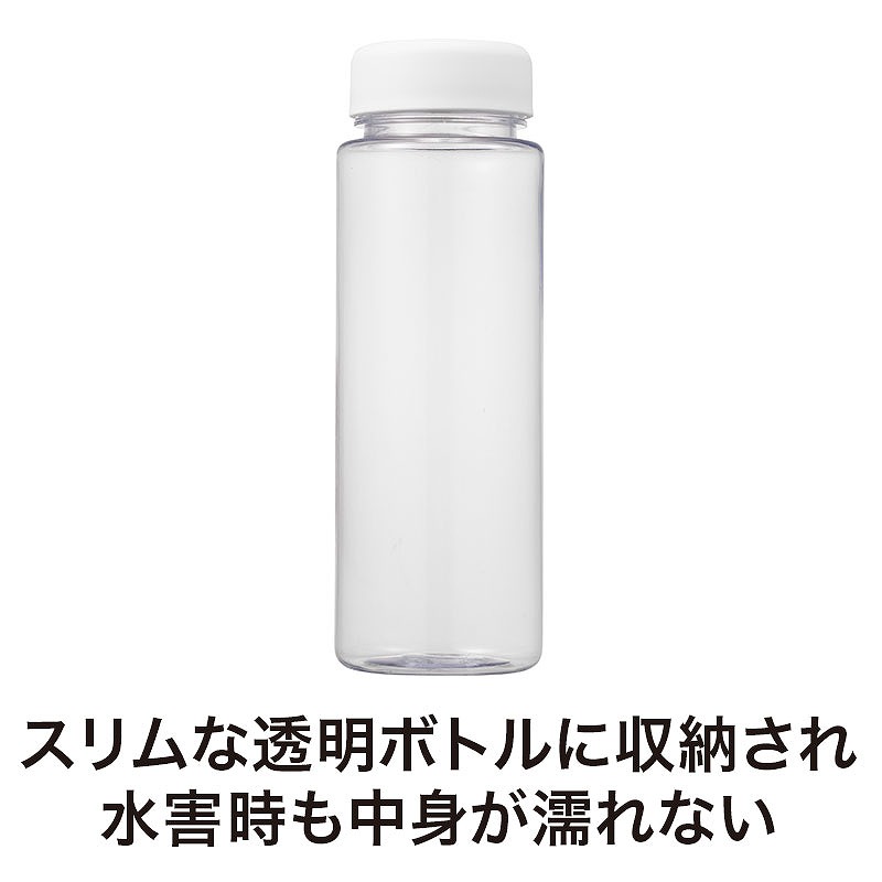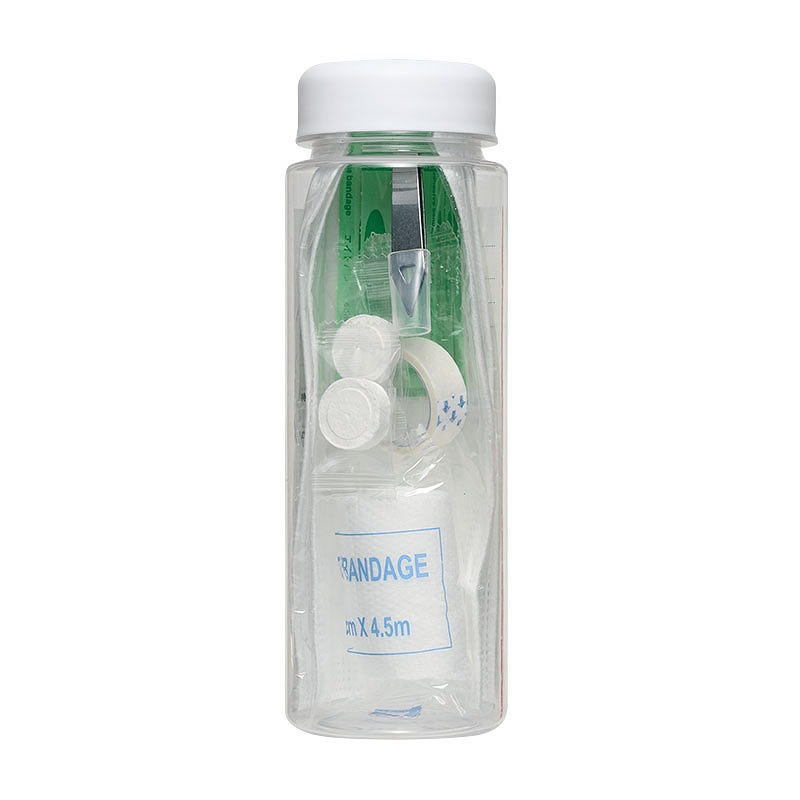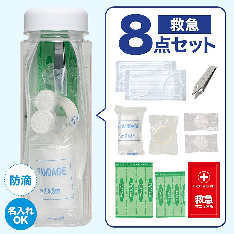 持ち運びしやすいボトルに、応急手当に役立つアイテムをまとめた便利なセットになっています。 セット内容は、ボトル、応急手当の方法をわかりやすく記載したマニュアルカード、PBT包帯、サージカルテープ、ばんそうこう(M×2・S×2)、とげ抜き、圧縮不織布タオル(2個)、マスク(2枚)。 ケガの手当てに使える基本的な用品に加え、「もしも」に備えたアイテムを揃えています。 スリムタイプのボトルにすっきり収納されているため、バッグに入れて持ち歩きやすく、災害などの緊急時にもすぐ持ち出せて便利です。 水害時でも中身が濡れにくく、安心して保管できます。 防災訓練や防災イベント、自治体や企業の安全啓発行事などでの配布品としておすすめ。 ボトル本体には会社ロゴやキャラクター、イベント名などの名入れも可能で、オリジナルの応急グッズとして手軽に作成できます。 実用性が高く、受け取った後も長く使っていただきやすいアイテムです。