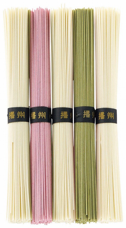内容量/50g×5束(播州そうめん×3・紫蘇そうめん×1・抹茶そうめん×1)、賞味期間/製造日より720日