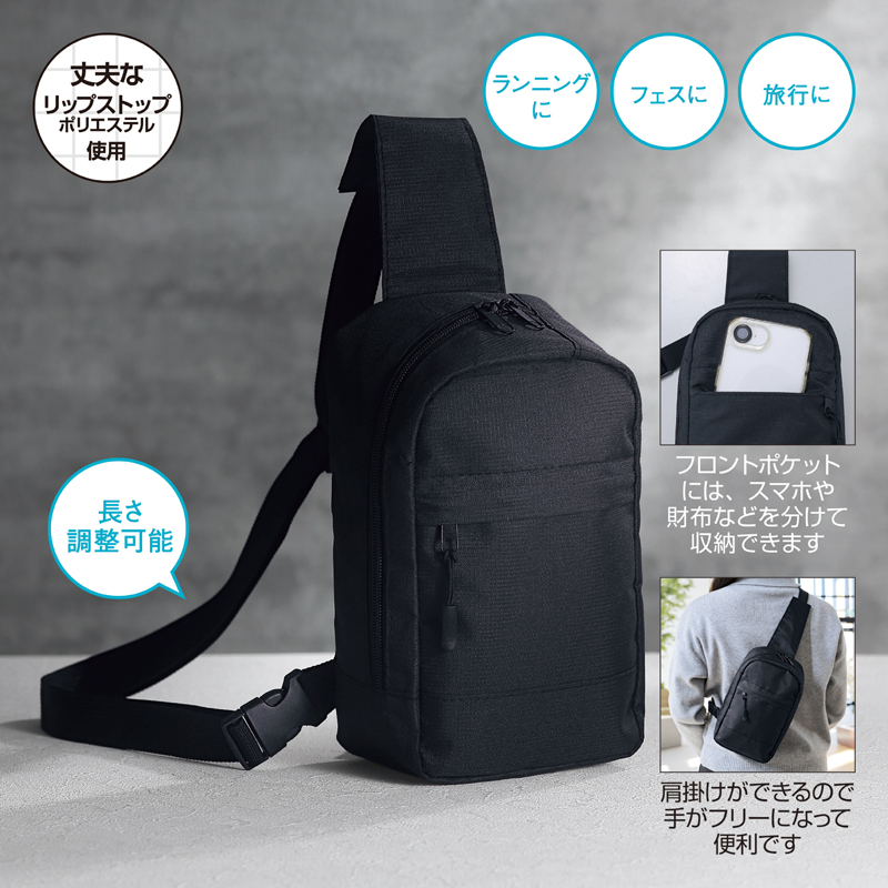 ワンマイルコーデやアクティブシーンに重宝。体にフィットしやすい形状で、年齢や性別問わず使えるバッグです。