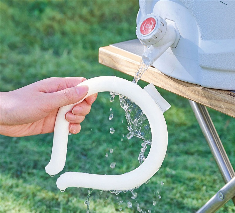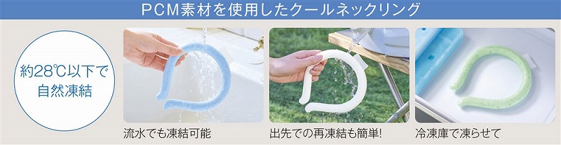 約28℃以下で自然凍結するPCM素材を使用しており、冷凍庫はもちろん、水道の流水でも凍結します。ひんやり快適な冷たさをキープし、炎天下での作業やアウトドアや野外イベント、通勤通学時にオススメです。男性にもフィットするサイズです。コストパフォーマンスにもご注目!