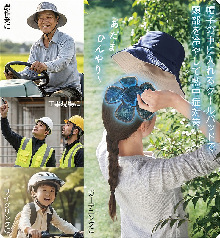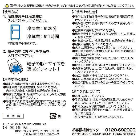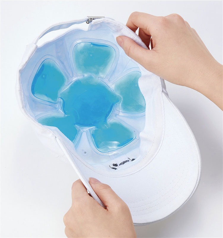 冷凍庫で約20分、冷蔵庫で約1時間以上冷やしてから帽子の内側にセットしてください。内容物は硬くならない不凍液なので頭の形にフィットします。暑い時季の農作業や工事などの現場仕事、自転車移動のシーンなどで熱中症対策として役立ちます。