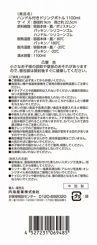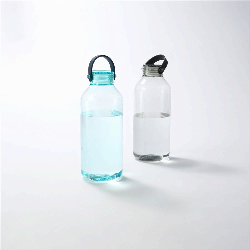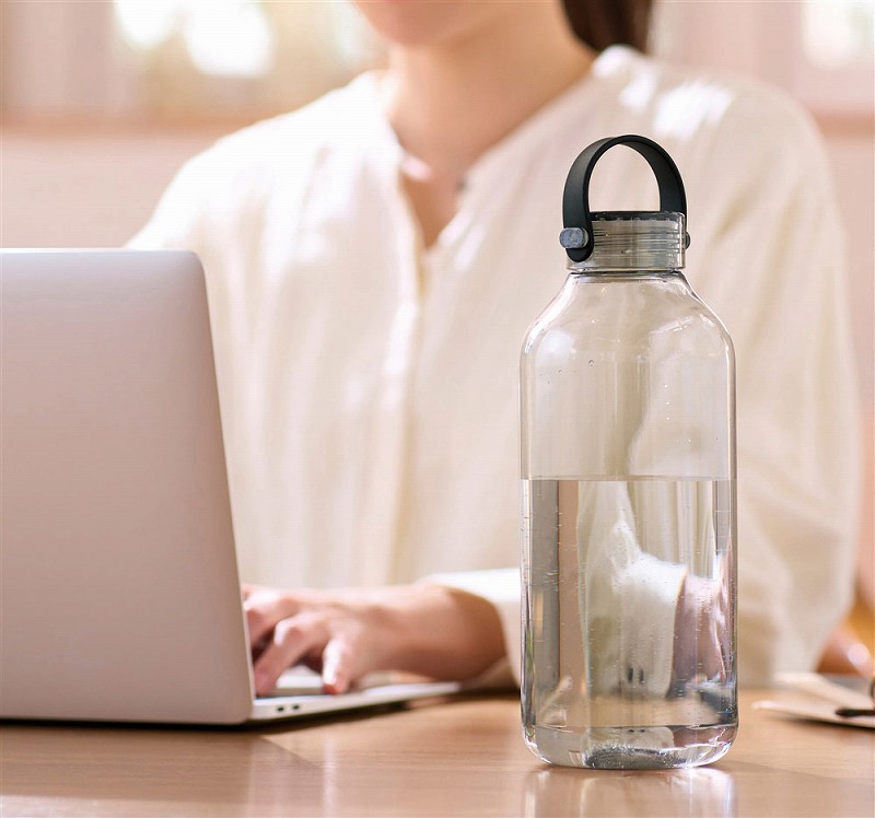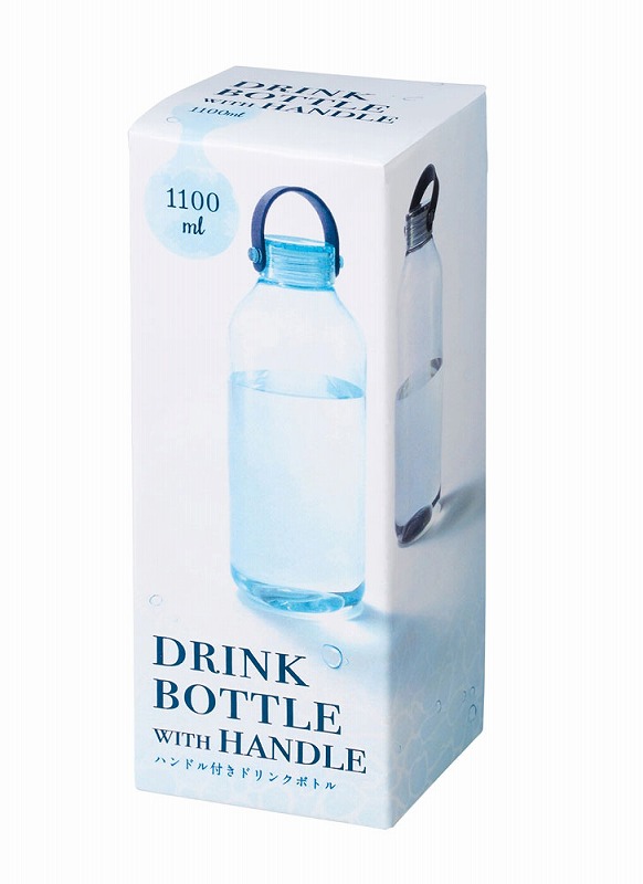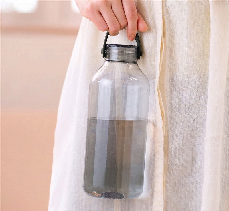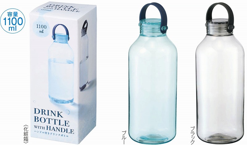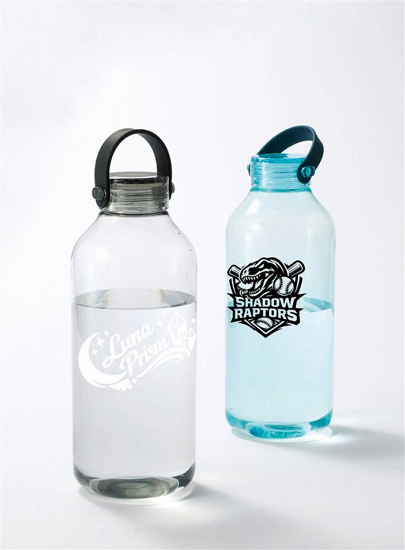 透明度が高く、においの少ないポリスチレン製のウォーターボトル。蓋は持ち運びしやすいハンドル付き。名入れ範囲も広く、ロゴなどを大きく印刷すればボリューム感もあいまってインパクトは抜群です。
