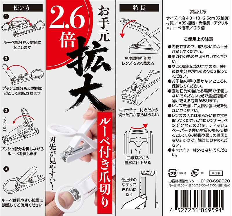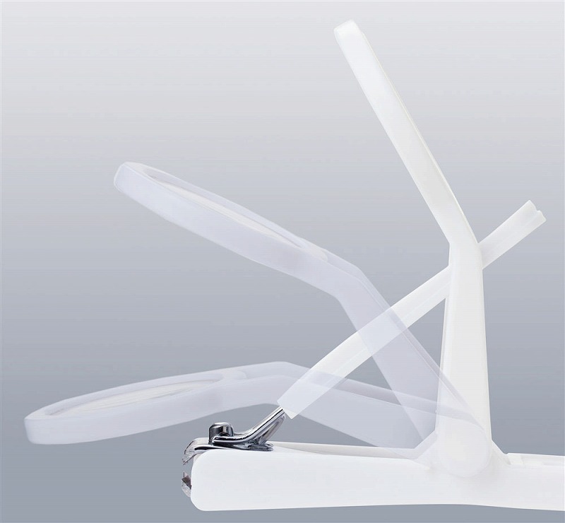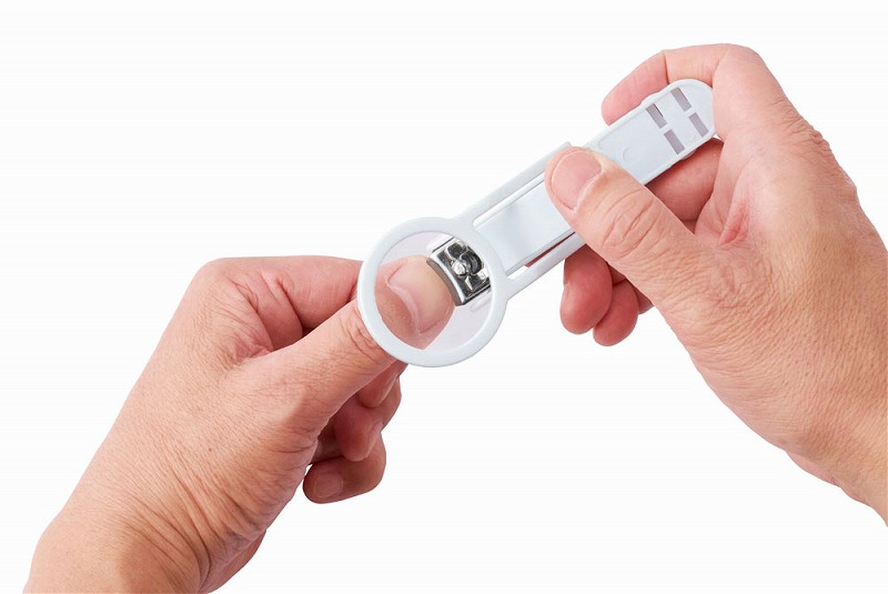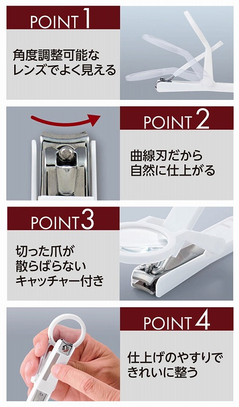 爪切りに便利なレンズが付きました。レンズは角度調整も可能です。刃先は自然なカットに仕上がる曲線刃で、本体にはカバー(キャッチャー)付きなので切った爪が飛び散りません。最後にやすりで整えたら、大人の身だしなみは完璧です!