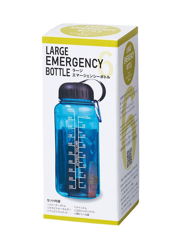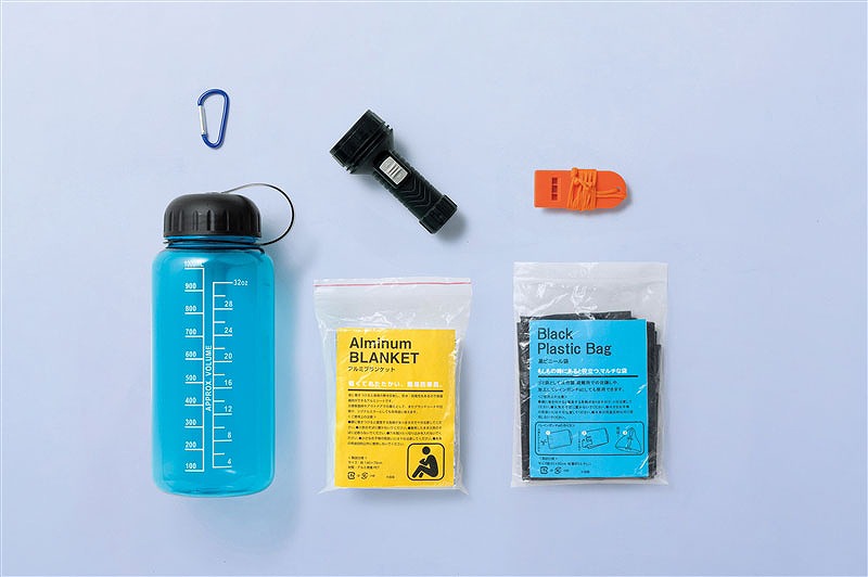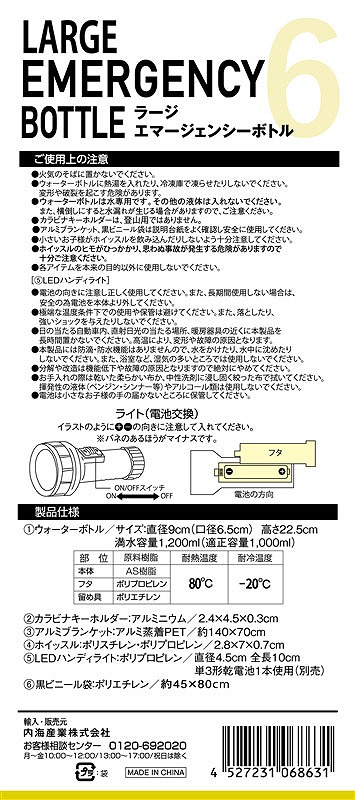<セット内容> ウォーターボトル×1・カラビナキーホルダー×1・アルミブランケット×1・ホイッスル×1・LEDハンディライト×1・黒ビニール袋×1 単3形乾電池1本使用(別売)