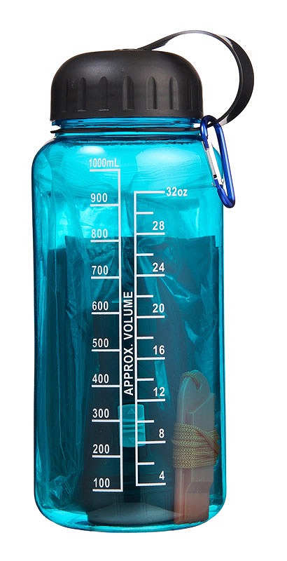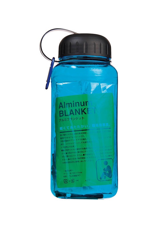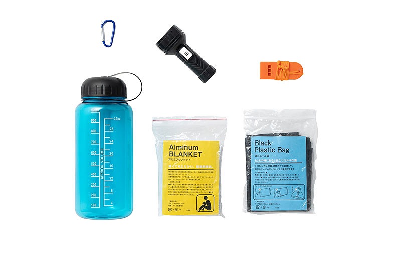 ウォーターボトル/直径9cm 高さ22.5cm(適正容量/約1000ml) カラビナキーホルダー/2.4×4.5×0.3cm アルミブランケット/約140×70cm ホイッスル/2.8×7×0.7cm LEDハンディライト/直径4.5cm 全長10cm 黒ビニール袋/約45×80cm