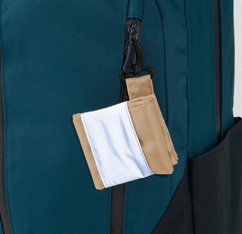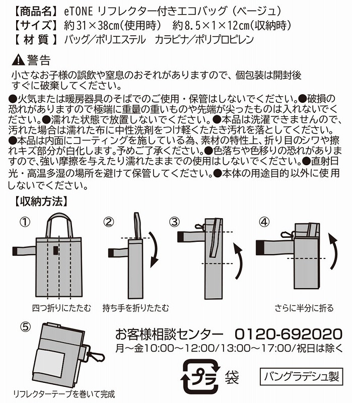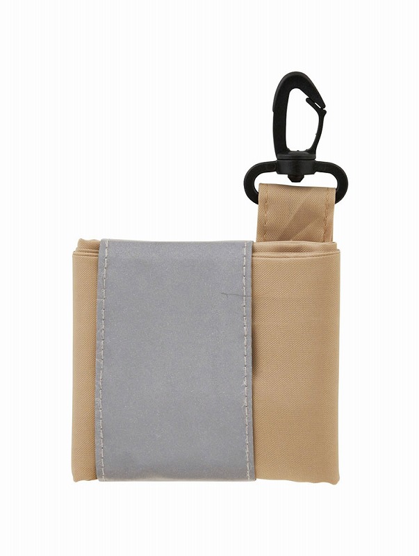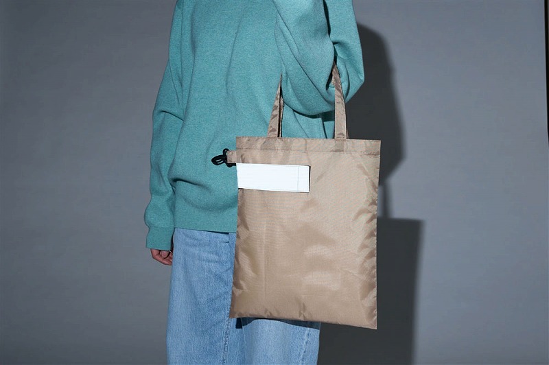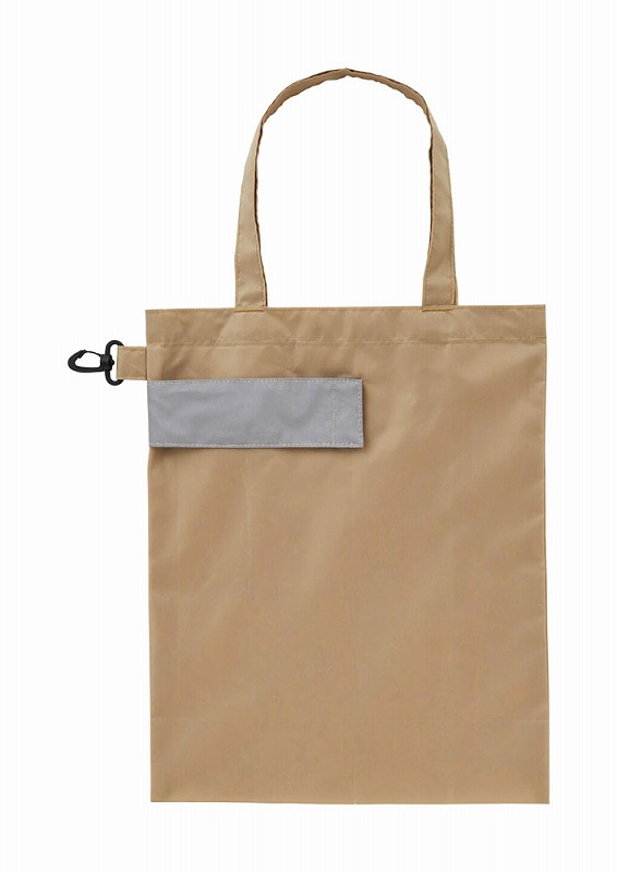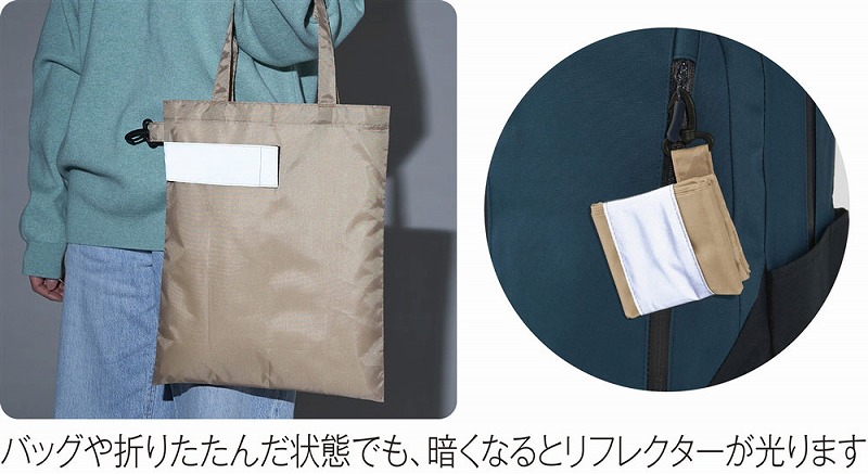 A4サイズが入るエコバッグは小さく折りたためて携帯にも便利。暗くなると、たたんだ状態でもリフレクターが光ります。どこでも取り付けられるカラビナ付き。シニア層も抵抗なく持てるベーシックな4色の中から色指定が可能です。
