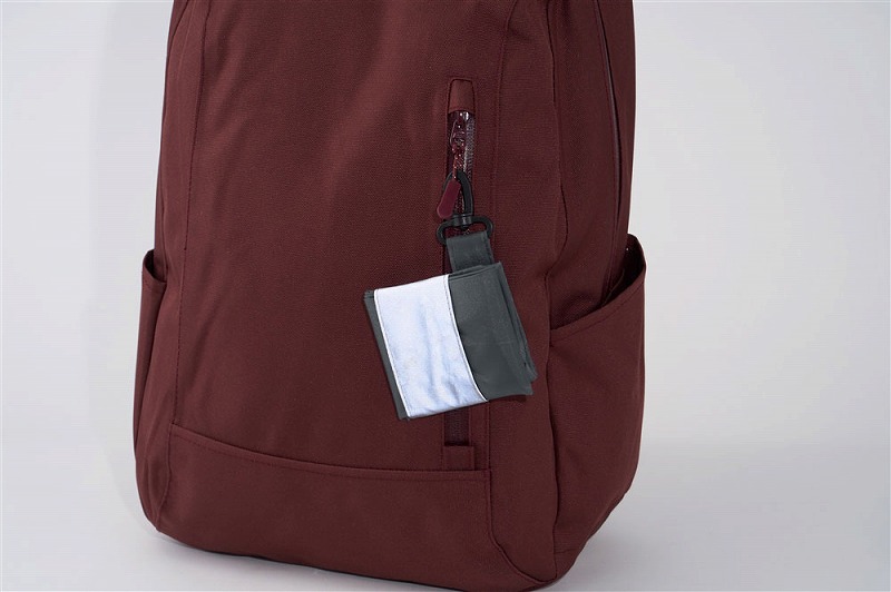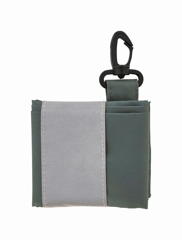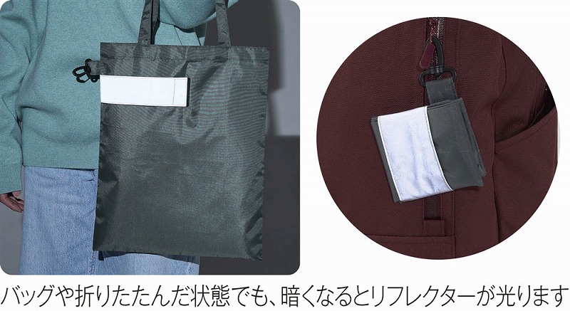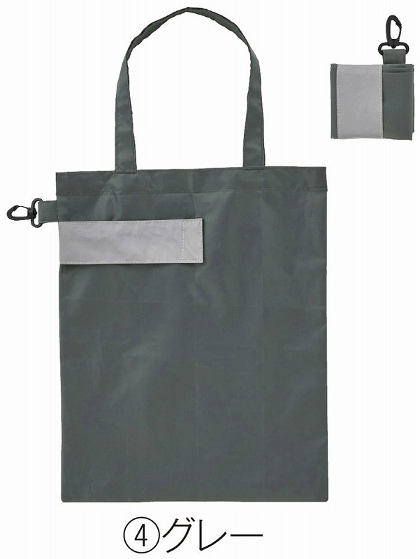 A4サイズが入るエコバッグは小さく折りたためて携帯にも便利。暗くなると、たたんだ状態でもリフレクターが光ります。どこでも取り付けられるカラビナ付き。シニア層も抵抗なく持てるベーシックな4色の中から色指定が可能です。