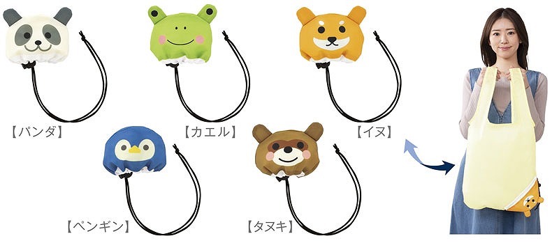バッグと収納部が一体化しているので、使用時に収納袋が邪魔になりません。肩掛け可能なB4くらいのサイズ感。愛くるしいペンギン・かえる・いぬ・パンダ・たぬきの5種類を取り混ぜてお届けします。ポケットにも入れて持ち運べるのでペットショップやスーパーのキャンペーン・購入特典のプレゼントにおすすめです。