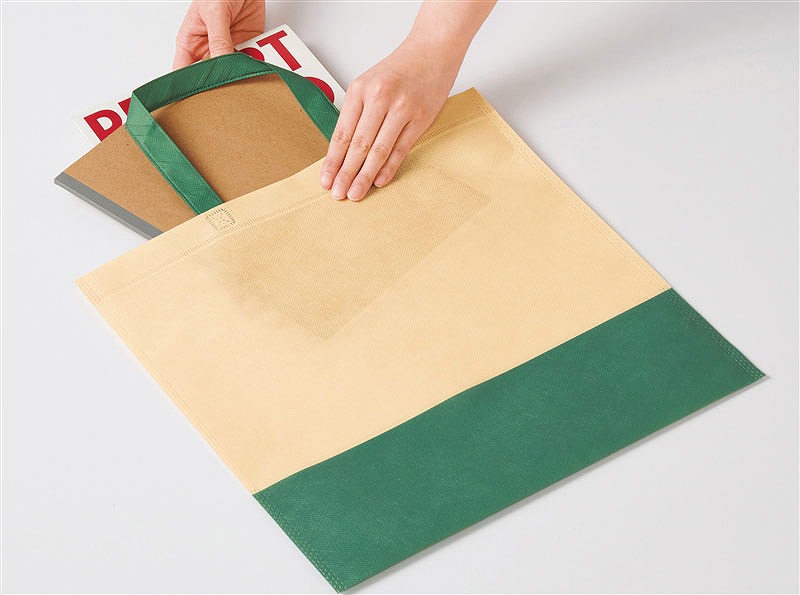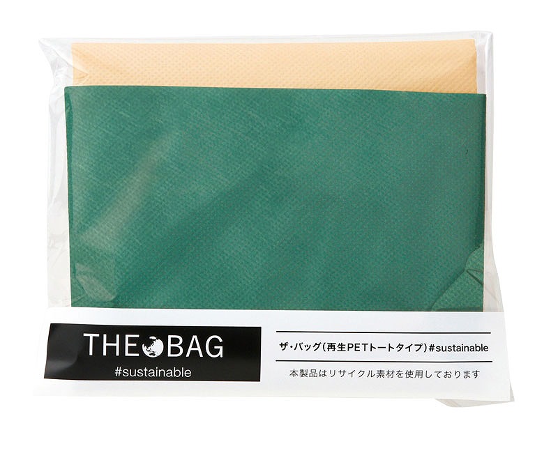環境にやさしい再生素材を使ったトートバッグは、マチがないフラットバッグで、ナチュラルな色味と小さくたためる点が特徴です。持ち運びや収納に便利で、A4サイズの資料や書類が縦にも横にも入る正方形のサイズ設計となっています。学校や会社などの展示会や説明会の資料配布や配布物の収納に最適です。