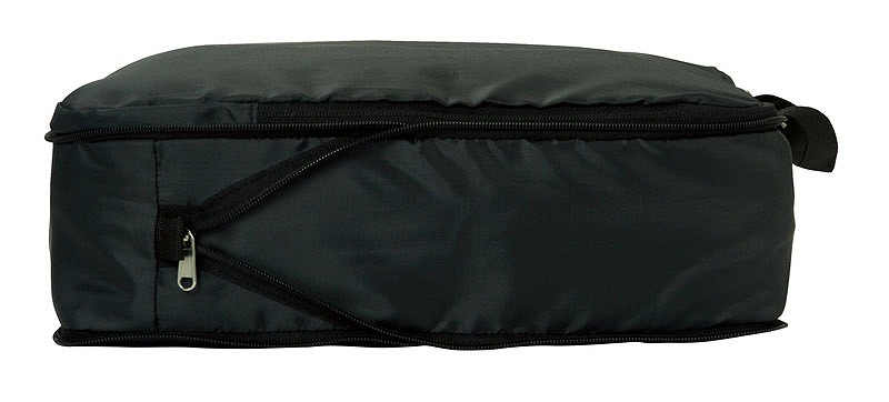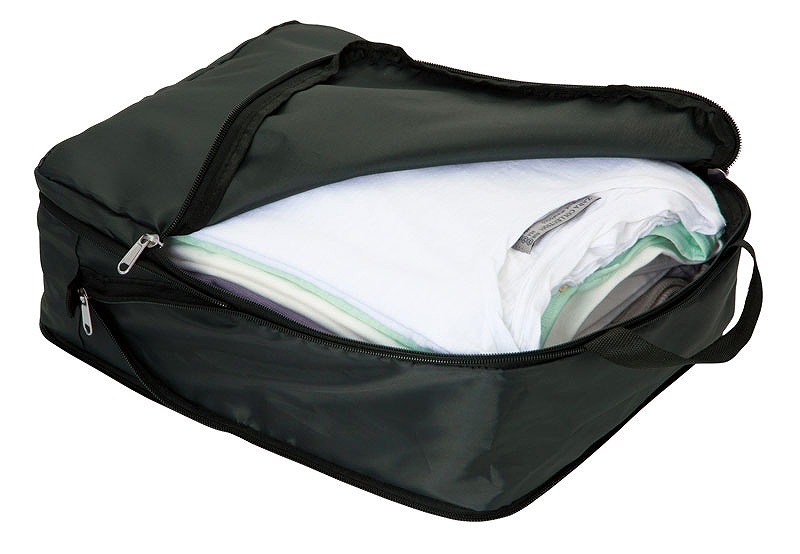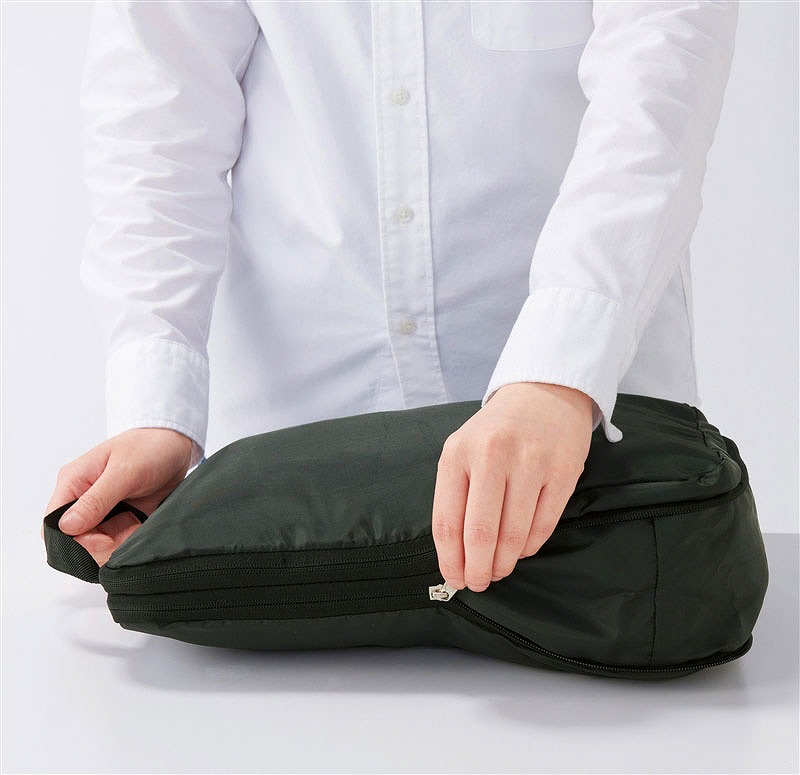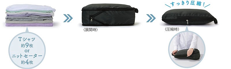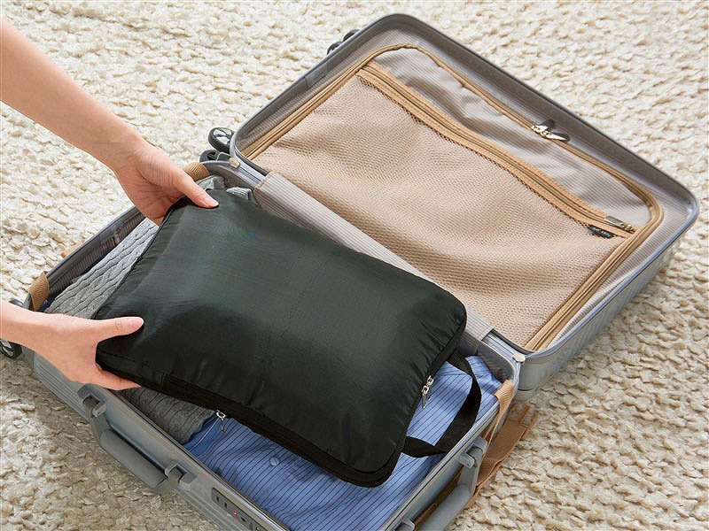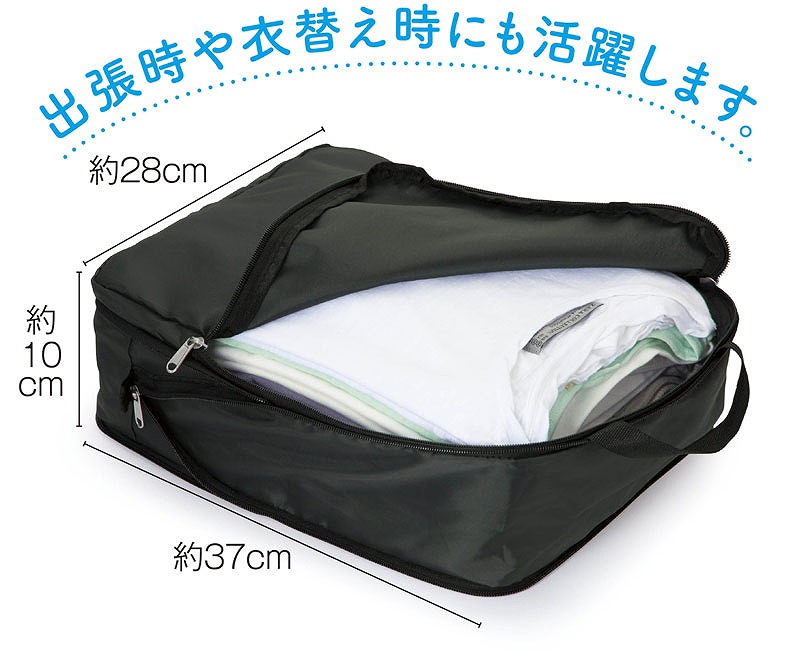 Tシャツなら約9枚・ニットセーターなら約4枚を入れて、約半分の厚みに圧縮できます。赤ちゃんのオムツや着替えをまとめたり、クローゼットで使用頻度の低い衣類の収納に。出張時や衣替えにも◎。ビニール製の圧縮バッグのように中身が見える心配がありませんので、ふいにキャリーケースを開ける場面でも安心です。