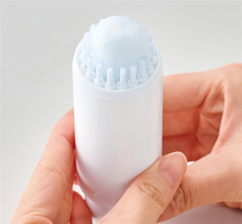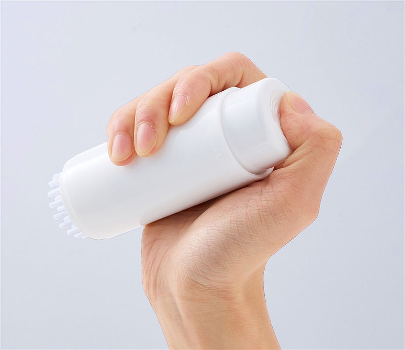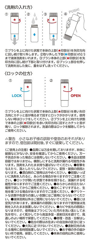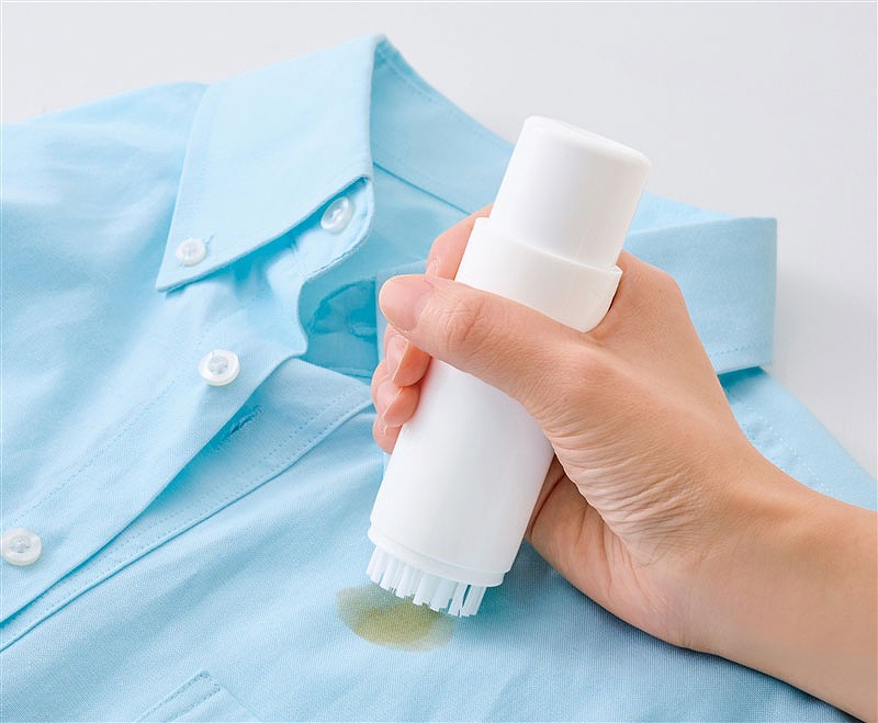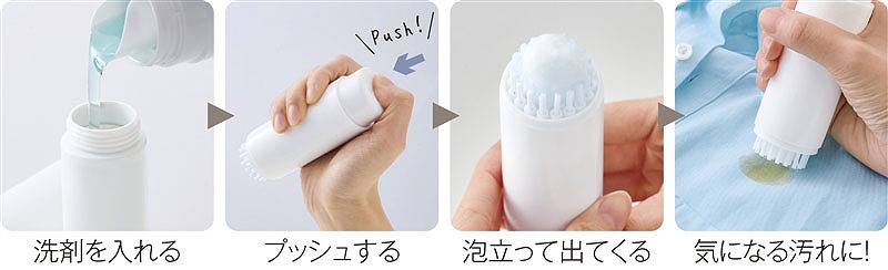 食べこぼしや衣類の汚れにすぐ対応できる携帯用の洗濯ブラシ。ボトルに液体洗剤を入れてプッシュするだけで、ブラシ部分から泡立った洗剤が出てくる便利設計。そのまま汚れた部分をこすり、気になる汚れをピンポイントでケア。旅行や出張にも持って行きやすいコンパクトサイズです。