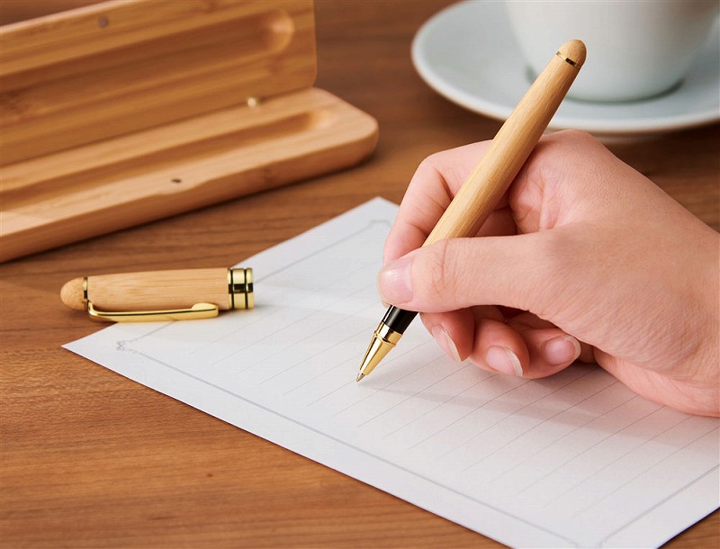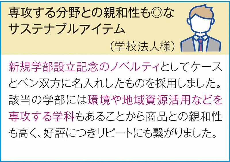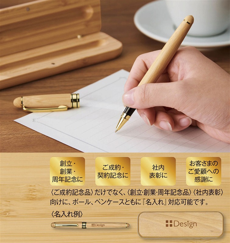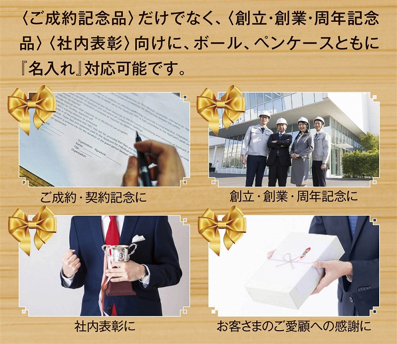 ボールペン/ケースともに名入れ可能。ご成約記念のほか、創立・創業・周年記念、社内表彰向けにおすすめです。この製品1個あたり、CO2排出量が5kgオフセットされます。